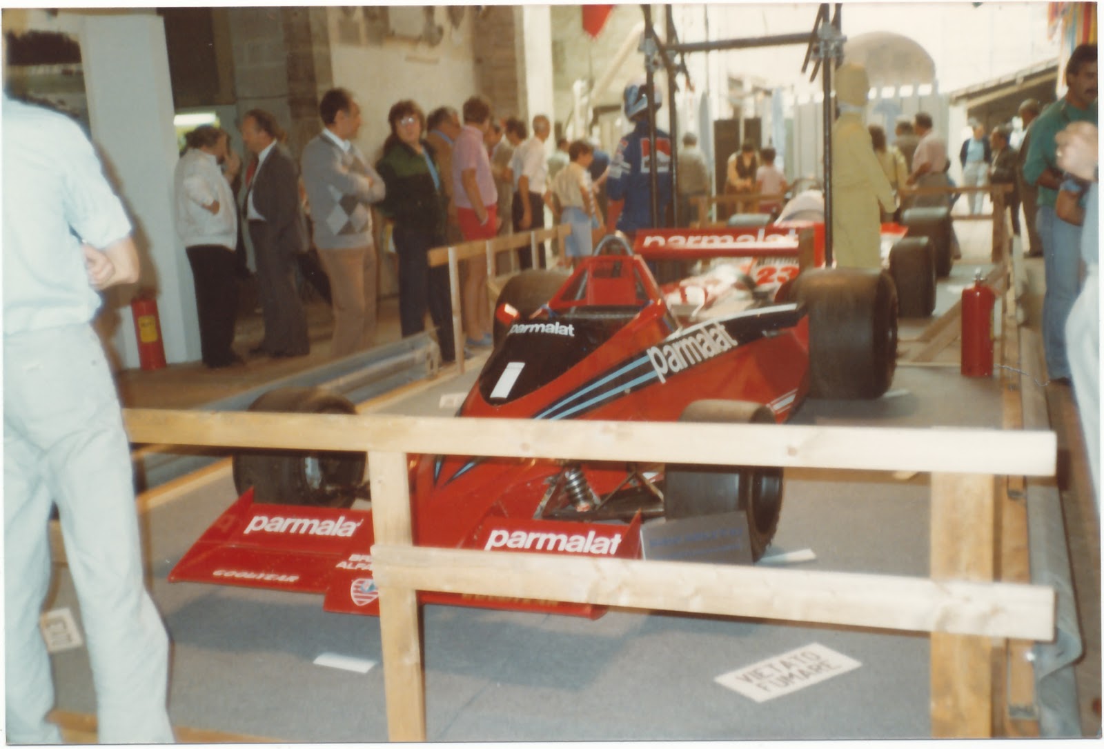 Qui siamo a Scarperia, settembre 1983: la Brabham-Alfa Romeo che accoglieva i visitatori nell\’atrio del Palazzo dei priori. In basso, alcuni modelli speciali; alcuni master presentati da Marcello Giorgetti.