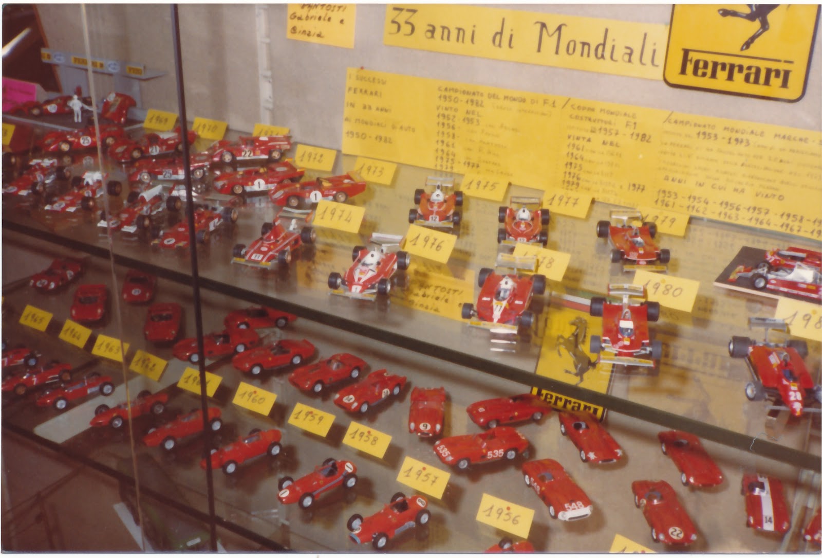 Gabriele Pantosti, attuale proprietario di MG Model, portava tutta la sua raccolta di Ferrari ufficiali e osservare i suoi modelli era un po\’ come ripercorrere la storia del Cavallino nelle corse. Mostra di Dreoni, autunno 1981.