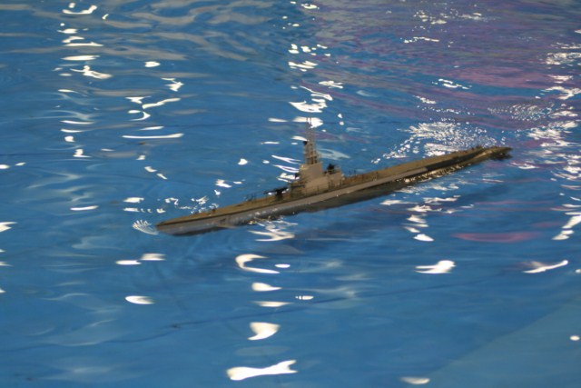 Sottomarino in azione nella vasca dedicata al modellismo nautico.