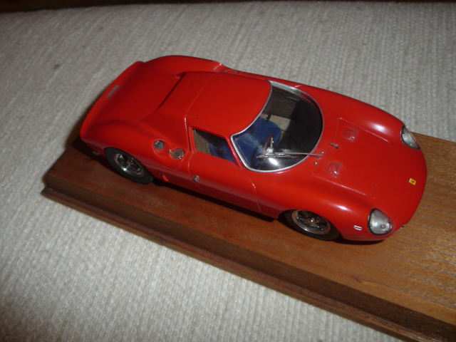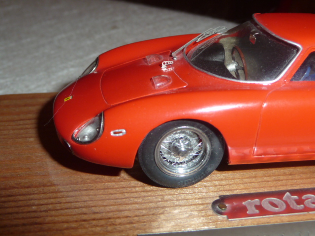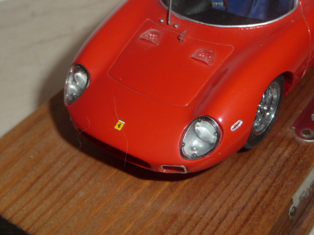 | Montaggio pulitissimo: notare l\’esattezza degli incollaggi delle cornici dei fari fotoincise e delle calotte in plexiglass. Le due calottine sul cofano sono in acetato trasparente. Notare il pelo di gatto appoggiatosi furtivamente sullo stemmino Ferrari. |