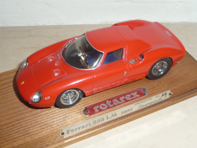 Non è molto ma è già qualcosa. Il modello montato più celebre di Rotarex è forse la Ferrari 250 LM, di cui esistono due versioni, una \”presentazione\”, l\’altra in livrea NART vincitrice della 24 Ore di Le Mans 1965. La Rotarex fece anche una serie di 330 P4 e 412 P (ne ho vista una nei colori Maranello Concessionaires Le Mans 1967), probabilmente più rare della 250 LM. Questa produzione risale alla metà degli anni ottanta: la 250 LM fu realizzata nel 1984 e secondo un paio di fonti l\’ultimo anno di esistenza del marchio Rotarex è il 1987.