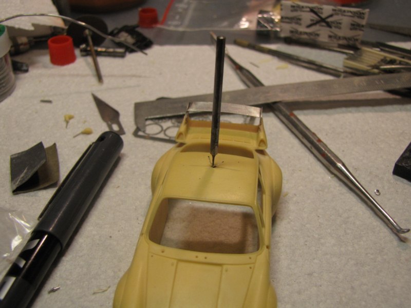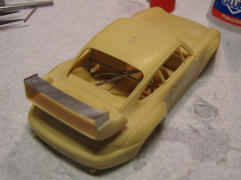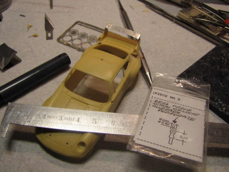 l\’ailéron est collé definitivement car il est très délicat à placer et il y avait un coté avec un espace. Vue de l\’arriere, les retroviseurs sont creusés pour du bare metal au montage, et les pièces sont fixées sur des axes.