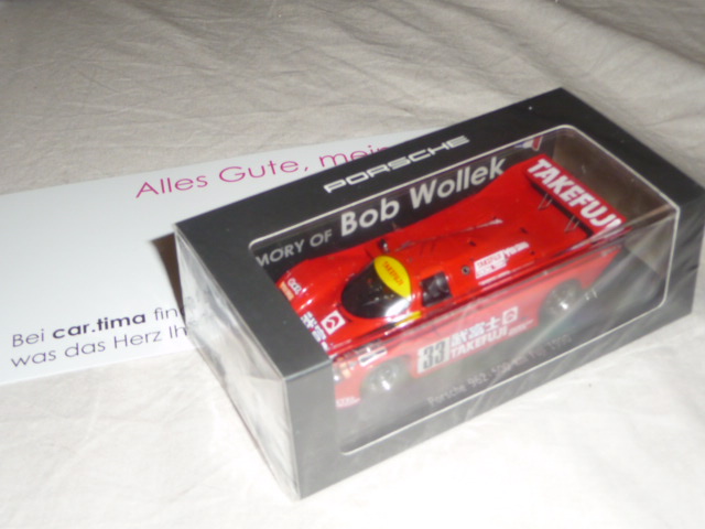 Dopo un periodo di pausa, riprende la produzione di serie limitate da parte del negozio tedesco Car.Tima in collaborazione con Spark. Particolarmente interessanti le ultime due uscite. Iniziamo con una Porsche 956 Gr.C ufficiale, in versione Fuji 1984, nella serie dedicata a Stefan Bellof. In quell\’occasione fu John Watson a prendere il posto di Derek Bell come compagno di equipaggio del pilota tedesco. Questa Porsche 956, telaio 009, ebbe una vita agonistica particolarmente lunga, debuttando proprio al Fuji, ma nel 1983, con Bell/Bellof, e disputando l\’ultima gara a Silverstone il 12 maggio 1985. La carriera della \”009\”, ormai rimpiazzata dal nuovo modello 962C, proseguì comunque per tutto il 1985 e nel 1986 come muletto.