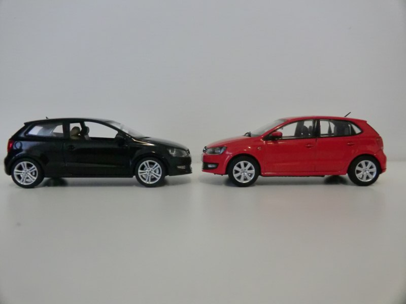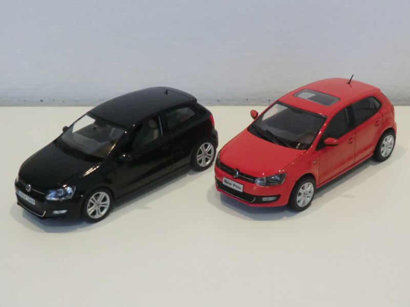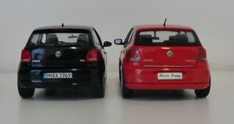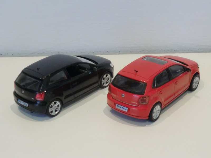 Che senso ha mettere a confronto due modelli apparentemente molto simili e della stessa auto per di più? Quello che ci interessa andare ad analizzare non sta tanto nelle realizzazioni in se quanto in ciò che sta dietro un modello costruito per il pubblico europeo ed uno per quello asiatico/cinese. In questo caso ho scelto due modelli abbastanza recenti ovvero la Volkswagen Polo 3 porte di Schuco (promozionale per la casa madre, è l’esemplare nero) e la Polo 5 porte di marca ignota ma prodotta per la Volkswagen Shangai (la rossa). Le differenze formali tra i modelli sono solamente di allestimento: le frecce laterali hanno posizioni diverse (sugli specchi per la versione europea, sul passaruota per la cinese), i cerchi sono diversi così come c’è il tetto apribile (che fa molto anni 80/90) e le scritte identificative con ideogrammi sulla cinese.