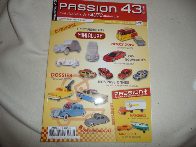 Rivista bimestrale con sede a Bordeaux, Passion 43ème, diretta da Didier Beaujardin (autore tra l\’altro di alcuni libri del settore, fra cui una ricerca completa su Norev), Passion43ème ha ormai raggiunto i 30 numeri, seppur con alcune difficoltà, che al momento sembrano essere superate. Per chi non la conoscesse, la rivista si pone più o meno sulla falsariga di Argus de la Miniature, anche se con alcune aperture in più verso l\’attualità. Rispetto ad Auto Modélisme l\’interesse principale è incentrato sul modello obsoleto, ma vi sono interessanti rassegne sulle principali borse di scambio con uno spazio dedicato ai pezzi più rari.