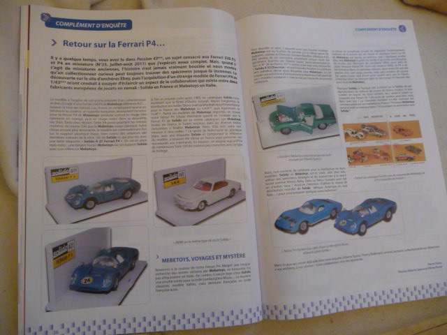 I primi prototipi (Simca 1000, Citroen DS19 e 2CV, Peugeot 104, Renault 5) sono già pronti per una produzione che dovrebbe avviarsi a fine 2012. Si prosegue poi con un curioso articolo sulla collaborazione, tutt\’oggi poco nota, fra Mebetoys e Solido, che dette vita ad una serie di modelli Mebetoys (Ferrari 330 P4, Chevrolet Rondine) commercializzati in Francia con base in plastica Solido e colori inediti, guarda caso molto vicini a certe tonalità utilizzate nella gamma della casa francese.