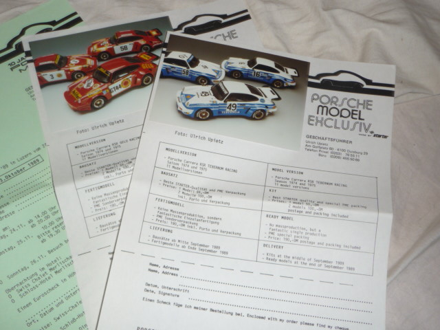 Era un fiorire di versioni inedite, con modelli esclusivi e montati molto bene da Renardy. Nelle edizioni di \”Porsche Modell\” ogni uscita era descritta dettagliatamente e veniva fornito un formulario di ordinazione spesso completo di un\’immagine su carta fotografica del modello. Un altro piatto forte del PMC era poi l\’offerta di foto: grazie all\’attività di Upietz e della sua Group C Production, il PMC era in grado di fornire una documentazione completa di praticamente tutte le principali gare endurance della stagione (WSC, IMSA, Le Mans, ma anche Super Cup), e questo nel periodo in cui Internet ce l\’aveva solo l\’esercito americano era qualcosa di incredibilmente utile e innovativo. Insieme alla documentazione di vetture reali venivano prodotti dei quaderni tematici in cui si raccoglievano alcune decine di immagini di modelli Porsche: particolarmente interessanti le edizioni che raffiguravano le elaborazioni, provenienti per lo più dalla collezione di Paul Roche.