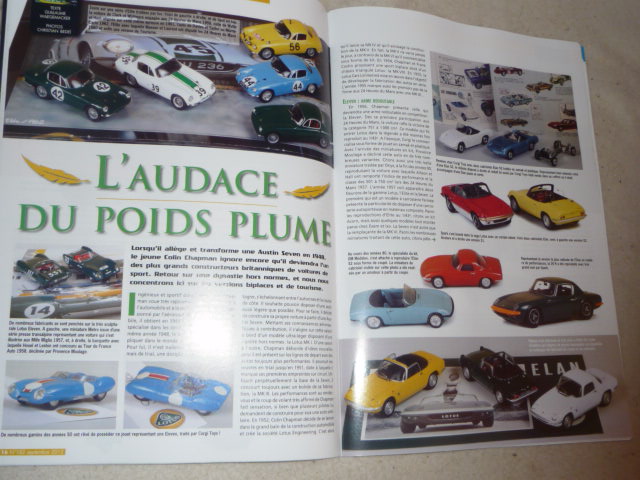 Andiamo avanti. Il numero di settembre di Auto Modélisme concede la quasi totalità dello spazio di copertina alle grandi scale, che sono giusto l\’argomento dell\’editoriale del direttore Alain Geslin. Ora che anche Spark ci ha preso gusto con l\’1:18 – si domanda Geslin – quali scelte faranno gli appassionati dell\’1:43? Resteranno fedeli alla scala piccola o si faranno tentare? Lasciando la risposta a questa domanda a chi ha voglia di fare previsioni, diamo un\’occhiata ai contenuti principali del numero, con un occhio di riguardo all\’1:43 (in fondo questo blog è dedicato a questa scala). L\’articolo tematico è dedicato alle Lotus GT in 1:43, con tante foto di modelli eterogenei (obsoleti, diecast moderni, speciali vecchi e nuovi), il tutto condito da una storia dello sviluppo delle Lotus stradali.