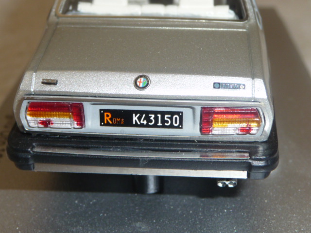 | Il posteriore ricco di dettagli. Davvero belli i gruppi ottici: qui per uno strano effetto del flash i vari colori (rosso, rosso scuro, bianco, arancio) non sembrano ben definiti nei loro spazi, cosa assolutamente fasulla. Il fascione centrale in plastica e il relativo listello di contorno sono realizzati con grande finezza. Un po\’ meno convincenti i terminali di scarico, il cui interno nero non è dipinto con molta precisione. Purtroppo il numero di targa è incoerente, essendo \”Roma-K\” un\’immatricolazione del 1971. Un\’immatricolazione tipo \”Roma-43150K\” (con la K in fondo) sarebbe stata verosimile e avrebbe collocato la vettura intorno al 1984. Notare che i numeri 43150 richiamano la referenza di catalogo del modello, mentre \”K\” starà evidentemente per \”Kess\”, ma ne è appunto venuta fuori un\’immatricolazione inverosimile. Si sarebbero salvati capra e cavoli spostando la K in fondo. |