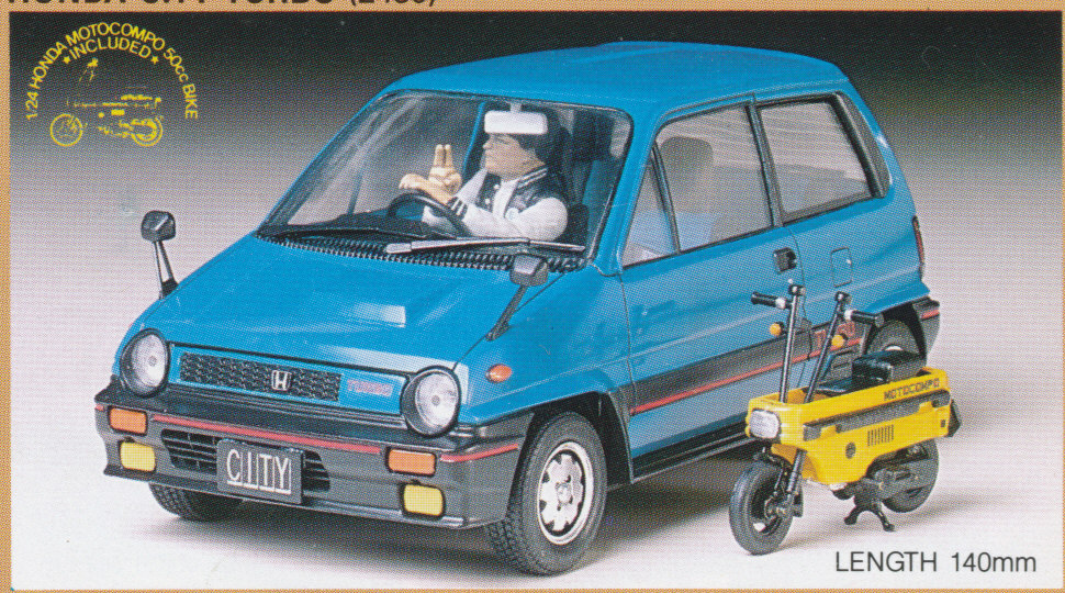 Facendo una piccola pausa al tavolino di vetro mi è tornata in mente una storia apparentemente senza troppa importanza di molti anni fa; di quelle storie, però, in grado di influenzare i gusti e certe scelte di un collezionista. Una storia come ne capitano tante a chi ha la tendenza compulsiva ad accumulare riproduzioni in scala di veicoli a motore (perfettamente inutili, ma questo è un altro paio di maniche). Negli anni ottanta, ai tempi delle medie, ero affascinato dalle utilitarie giapponesi, con quelle loro plastiche esotiche e gli attacchi rossi delle cinture di sicurezza con scritto \”press\”. Per la verità \”press\” c\’era scritto anche sulle Fiat, sulle Volvo o sulle Renault, ma quel \”press\” mi sembrava così giapponese, insieme alla sensazione scatolosa e plasticosa, quel \”bleng\” di quando un\’insegnante del collegio svizzero ove ero stato recluso d\’estate (poi ho continuato a scontare la pena agli arresti domiciliari) chiudeva la portiera della sua Toyota Celica rosso fegato. Cose, insomma, che non si dimenticano. Ad uno dei ragazzi della famiglia che ci affittava ogni estate la casa a Weggis, nei pressi del lago di Lucerna, una volta portammo un kit della Tamiya in scala 1:24 abbastanza inusuale, una Honda City con tanto di kit del Motocompo, una specie di micromotorino progettato per entrare giusto giusto nel bagagliaio della vettura.