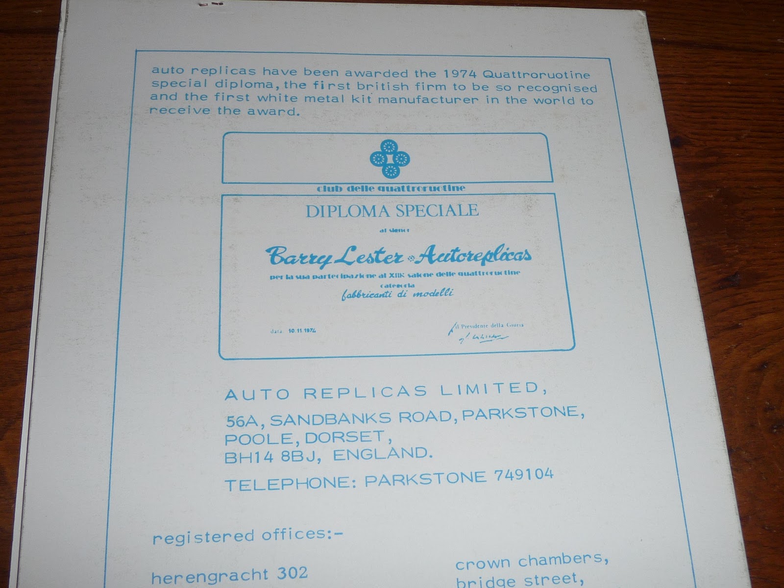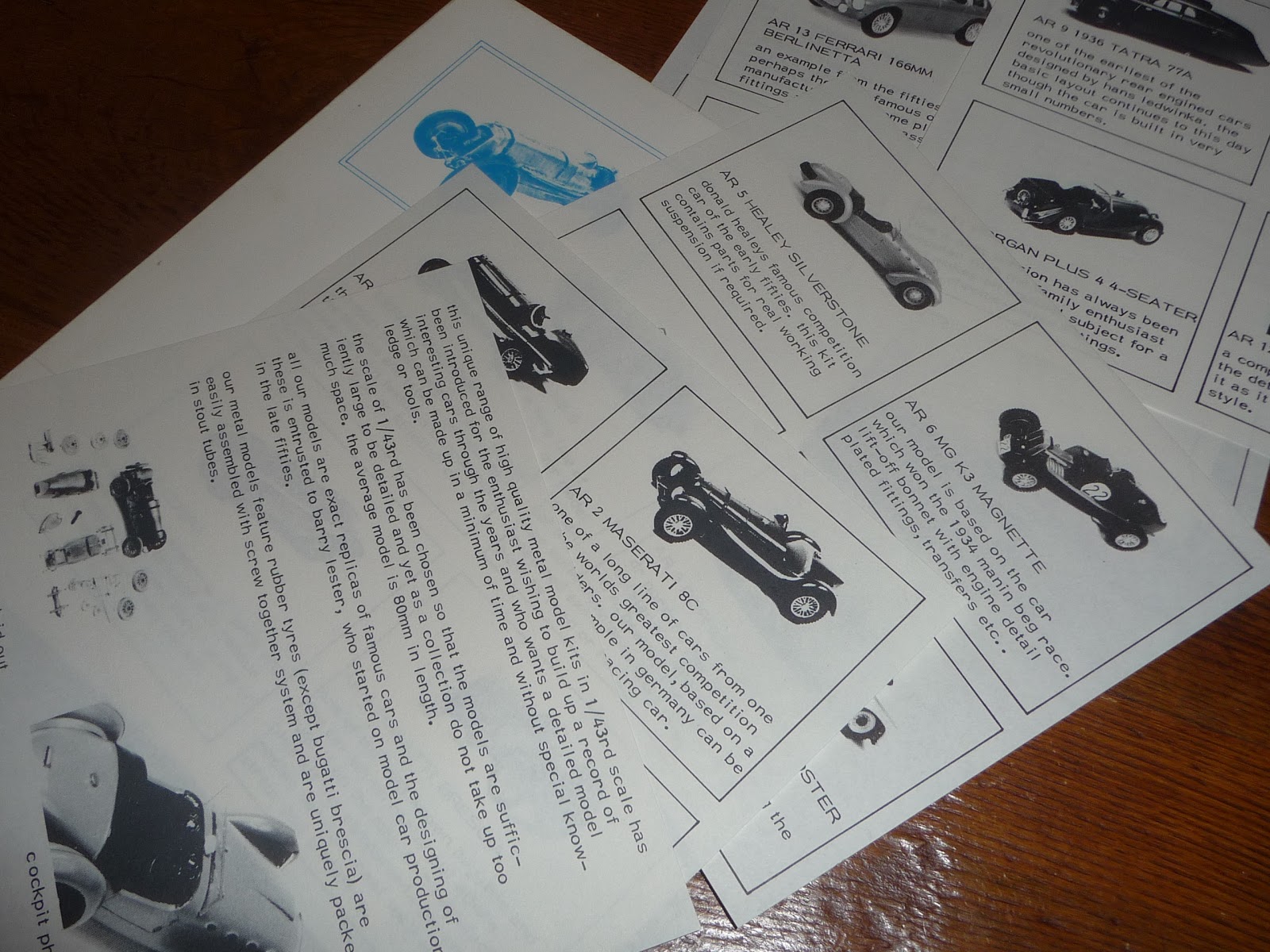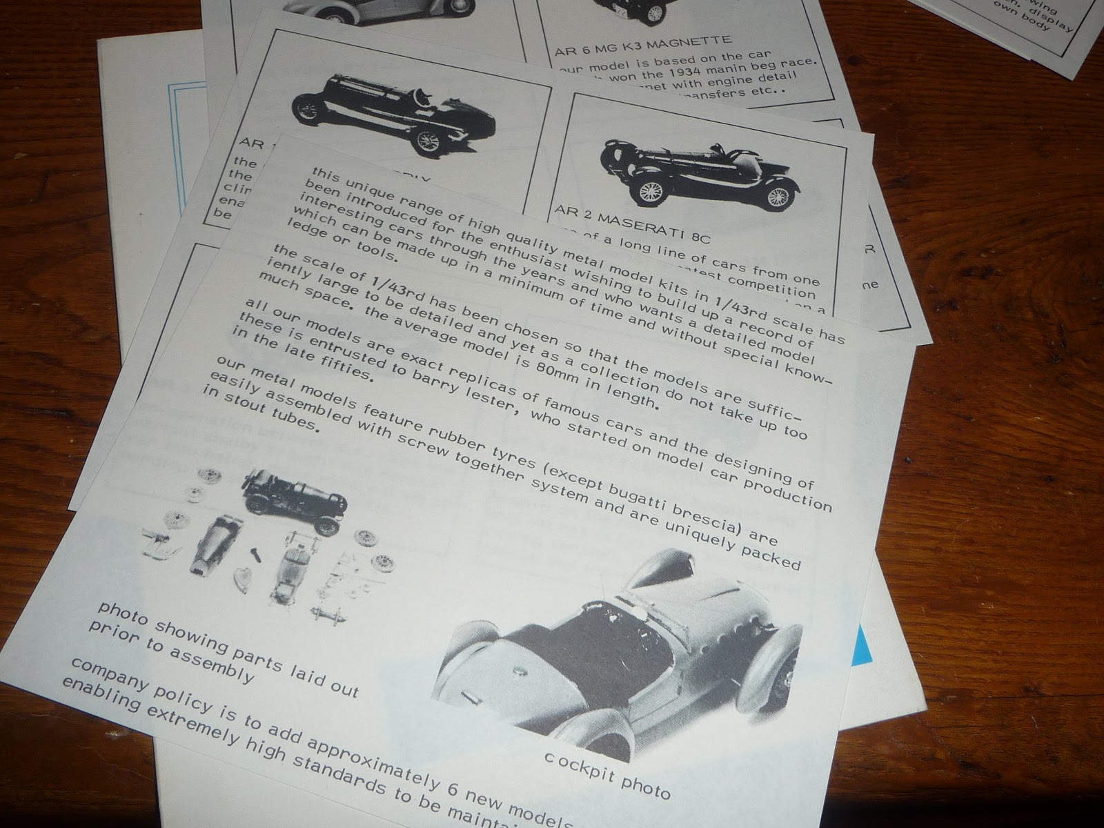 E\’ noto a tutti come il marchio di Barry Lester, Auto Replicas, sia stato fin dagli inizi all\’avanguardia nella produzione dei propri modelli. Non è raro trovare nelle confezioni dei factory built o dei kit materiale promozionale vario, dal piccolo cataloghino al pieghevole in quattro o otto parti. Questo documento l\’ho ritrovato di recente presso la libreria di Brands Hatch: si tratta di un portaschede contenente alcuni fogli sulla produzione Auto Replicas. Ciascun modello è riprodotto in disegno, accompagnato da note sulla vettura vera. Il primo foglio della serie, invece, è una breve descrizione dei modelli Auto Replicas. Sul \”verso\” del portaschede, la menzione del \”diploma speciale\” ottenuto da Lester da parte del Club delle Quattroruotine nel 1974. Il 1974 è quindi il terminus post quem evidente per la datazione del catalogo. Quanto al terminus ante quem, considerata l\’assenza di alcuni modelli usciti fra il 1976 e il 1977, direi che potrebbe collocarsi agli inizi del \’76. Il catalogo è quindi da datarsi fra il 1974 e la fine del 1975. Era un periodo in cui il collezionismo di modelli speciali era ancora agli albori e tali modelli venivano considerati con grande ammirazione, visto che i termini di paragone erano i vari Dinky, Solido, Mercury e Corgi che inevitabilmente erano concepiti più che altro come giocattoli. Si collezionava praticamente tutto quello che usciva e la Ferrari di Le Mans stava accanto alla Era degli anni 30, la Bugatti anni 20 accanto alla Mirage del 1974 e la Cooper di F.1 accanto alla Jaguar stradale. I modelli speciali esercitavano il loro magnetico fascino in quelle scatole spesso spoglie, di cartone marroncino o avorio, lontane dalle decorazioni che abbellivano le confezioni dei modelli industriali. Era una specie di garanzia di \”serietà\”, mentre dagli scaffali occhieggiavano anche le buste coi kit John Day e Manou. Un giorno approfondiremo il discorso su Barry Lester, Auto Replicas e gli altri marchi afferenti alla sua produzione. Ecco intanto alcune immagini di questo documento con ormai quasi 40 anni sulle spalle.