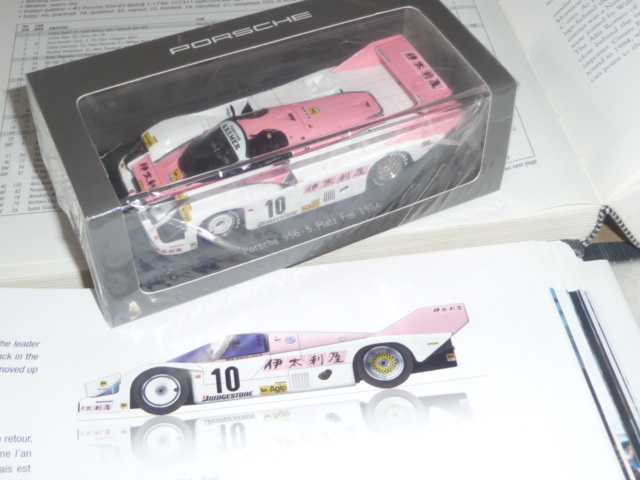 Le vetture dai colori bianco-rosa \”Italya Sports\” possono costituire ormai una piccola tematica. E\’ con interesse che va accolta l\’uscita di questa Porsche 956 Kremer, nella vivace livrea bicolore, che partecipò alla 1000km del Fuji nel 1984. Si trattava del telaio 101, classica proprietà del team Kremer, che fra il 1983 e la fine del 1984 aveva disputato già tredici gare con varie livree, tutte molto note (da GPI a Kenwood, da Boss a Swatch, da Dallas a Warsteiner, eccetera). Già alla gara del Fuji dell\’anno prima questa 956 aveva vestito i colori bianco e rosa dello sponsor giapponese, e nel 1984 si ripresentava con uno schema quasi invariato, ma con un vistoso alettone anteriore, comune ad altre 956; il caratteristico disegno più angoloso della paratia dell\’ala posteriore era stato introdotto proprio dalla gara del Fuji dell\’anno precedente (mentre in prova era stato utilizzato il tradizionale profilo con andamento più tondeggiante). Manfred Winkelhock e Mike Thackwell ottennero un buon quinto posto finale, in una gara dominata dalle due 956 ufficiali di Bellof/Watson (*) e Mass/Ickx, rispettivamente prima e seconda nello stesso giro. Questo modello, realizzato da Spark in collaborazione con Porsche e Cartima (catalogo numero CAP04311016), è in serie limitata e numerata di 300 pezzi e presenta tutte le specificità della 956 di Kremer del 1984. Un\’altra bella realizzazione, accurata e molto ben montata. Da porschista convinto posso affermare che delle 956 e delle 962 non ci si stanca mai!