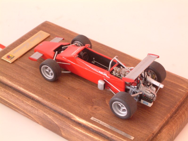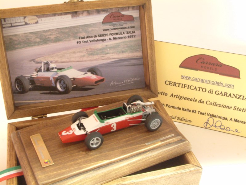 Dopo l\’Abarth SE025 Formula Italia 1:43, uscita qualche mese fa in versione presentazione, Denis Carrara ha terminato altre due varianti: la prima, piuttosto semplice, riproduce la vettura vista a Vallelunga durante un test con Arturo Merzario; per la seconda si può parlare di un modello a se stante, e anch\’esso inedito, come lo era stata la F.Italia: si tratta della vettura in configurazione Formula Libera, dotata di appendici aerodinamiche e di altri dettagli specifici. Anche in questo caso i modelli, in resina con particolari della meccanica e lo chassis in metallo bianco, sono disponibili solo montati in due gradi di finitura: quello più curato, offerto in una bella scatola di legno con la foto della vettura vera, e quello più standard, sulla tradizionale base in plastica nera con vetrinetta in plexiglass.