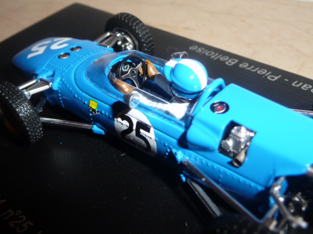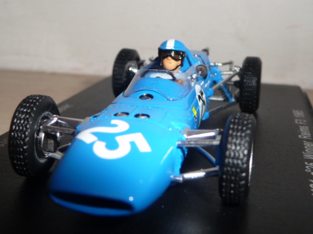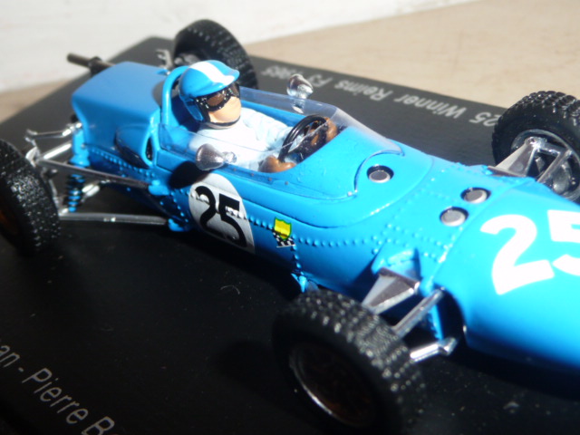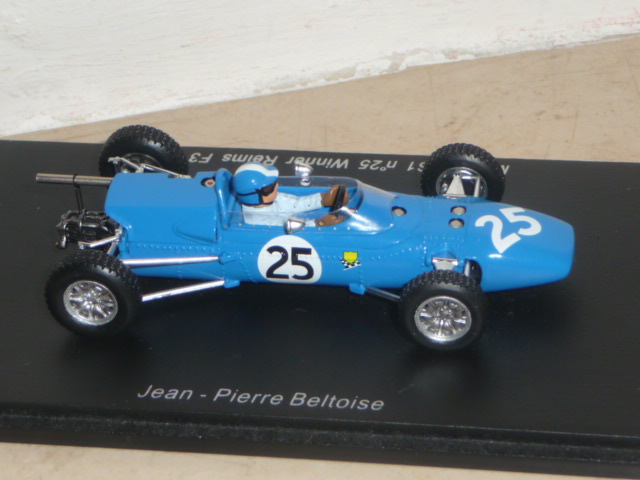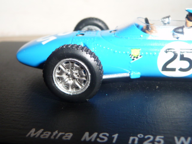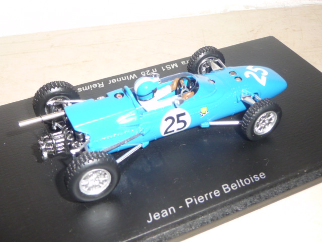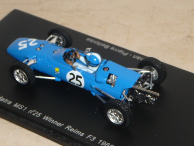 Anche se con un po\’ di prudenza, Spark sta saggiando il campo delle formule minori. Dopo un paio di Lotus F.2, esce questa Matra MS1 di F.3 (catalogo S1598), una novità particolarmente interessante, che probabilmente prelude ad altri modelli di una categoria che nella seconda metà degli anni sessanta conobbe un periodo particolarmente felice, con un proliferare di costruttori e di team che lanciavano piloti destinati a farsi strada fino alla Formula 1. Sarà perché il mio ricordo di collezionista va spesso a un vecchio kit Heller in plastica acquistato nel lontano 1985 in Svizzera, fatto sta che questa Matra di Spark per me ha un richiamo particolare, come del resto tutti gli altri \”formulini\”. Non oso immaginare che manna sarebbe se Spark si mettesse a fare le Brabham, Lotus, Cooper, Alpine, Pygmee, Merlyn… Chissà. Intanto abbiamo questa MS1 che rappresenta una tappa importante nella storia del costruttore francese: la versione prescelta è infatti quella della vittoria di Jean-Pierre Beltoise alla Coupe Internationale de Vitesse a Reims, disputatasi il 4 luglio 1965. Tanto per curiosità, nello stesso weekend erano in programma la famosissima 12 Ore, il Grand Prix de France di Formula 2 e la Coupe des Provinces… Due giorni belli intensi! Nella gara di Formula 3, Beltoise, iscritto dalla Matra insieme a Jean-Pierre Jaussaud, non era probabilmente il favorito. Partito abbastanza indietro, in corsa si dimostrò efficacissimo, facendo segnare il giro più veloce e andando a vincere davanti a Piers Courage (Brabham-Ford) e J.Fenning (Cooper). Jaussaud, con l\’altra Matra, terminò al 10° posto. Non amo la storia dell\’automobilismo fatta da pura cronaca, ma queste poche righe spero siano state utili a contestualizzare (come si suol dire) la vettura nella sua epoca. Vettura che, tra l\’altro, è conservata nell\’unico museo dedicato alla Matra, sul quale vi consiglio di visitare, ad esempio, questo sito web .