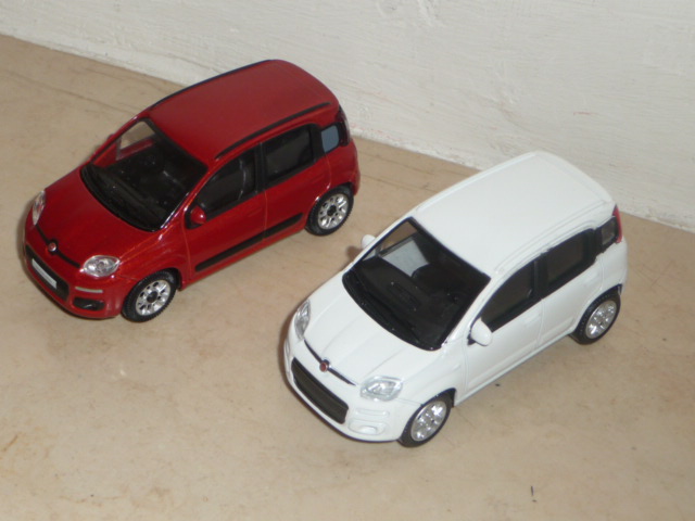 La Fiat Panda modello 2011 ha sostituito il modello precedente, che era stato presentato nel 2003, e si caratterizza per una maggiore rotondità delle linee, per degli ingombri leggermente maggiori e per una migliorata funzionalità. In scala 1:43, due i modelli disponibili per pochi euro ciascuno (siamo nella fascia sotto i 5 !), prodotti da Mondo Motors e da Motorama. Il primo si fregia di prodotto ufficiale Fiat, e anche la scatola riporta il caratteristico bollino di \”official product\” con numero di serie. Entrambi hanno la classica configurazione di questo tipo di modelli, carrozzeria in zamac, chassis e interni in plastica, ruote/gomme in plastica. Ecco un breve confronto fra le due interpretazioni, delle quali la migliore sembra la Mondo Motors, anche se il Motorama ha qualche particolare in più che manca al modello concorrente.