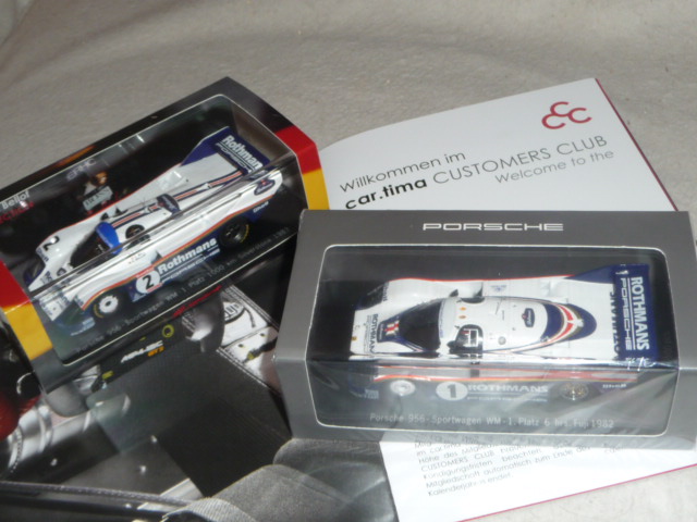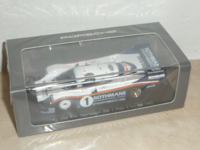 Le varianti delle Porsche 956 ufficiali sono pressoché infinite: a partire dal 1982 la partecipazione delle celebri 956 con i colori Rothmans fu massiccia, non solo agli eventi del Mondiale endurance ma anche in altre gare non titolate ma ugualmente significativa. A parte le versioni più famose realizzate in passato soprattutto dai leader dei kit in resina, restano molte varianti da riprodurre, e ci stanno pensando i vari committenti (negozi, importatori, ecc.) a colmare queste lacune. Sono due le più recenti acquisizioni; andiamo per ordine cronologico di versione: la prima è un modello con scatola ufficiale Porsche (edizione limitata e numerata a 300 esemplari) ma distribuita da Cartima. Il numero di catalogo segue il criterio Porsche (CAP04311025). Si tratta della vettura telaio 003 che si aggiudicò la 6 Ore del Fuji il 3 ottobre 1982 con l\’equipaggio-simbolo di quegli anni, Jacky Ickx e Jochen Mass. La 956-003 fu largamente utilizzata in quella prima stagione del Gruppo C, debuttando con un secondo posto alla 24 Ore di Le Mans e ottenendo un filotto di quattro vittorie a Spa, Fuji, Brands Hatch e a Kyalami.