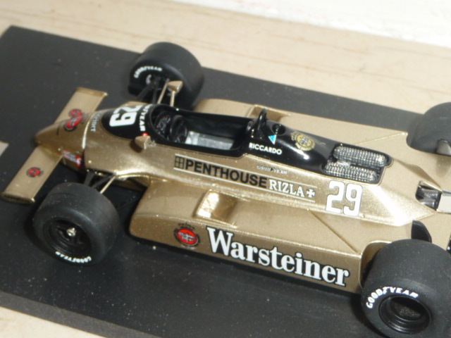 | Gli sponsor Penthouse e Rizla non coprirono l\’intera stagione. Lascia alquanto perplesso il colore nero satinato del rollbar: non ho trovato alcuna evidenza di un rollbar nero sulla Arrows A3 del 1980. In realtà dovrebbe essere color acciaio. |