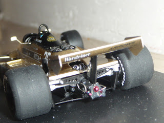 | Piuttosto dettagliato il retrotreno, con i particolari della trasmissione Hewland, i semiassi e i tiranti delle sospensioni, tutti elementi realizzati in metallo bianco, resina e fotoincisione. |
