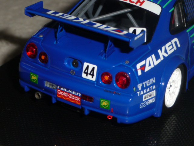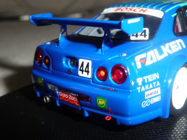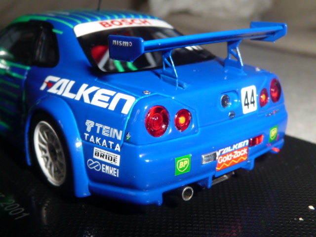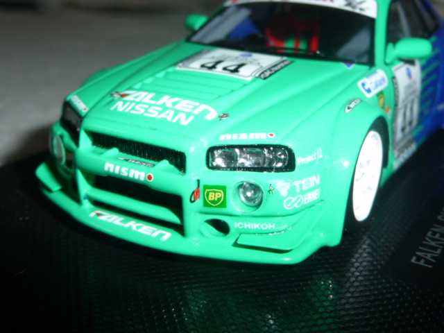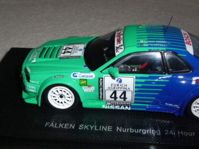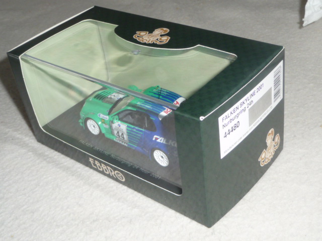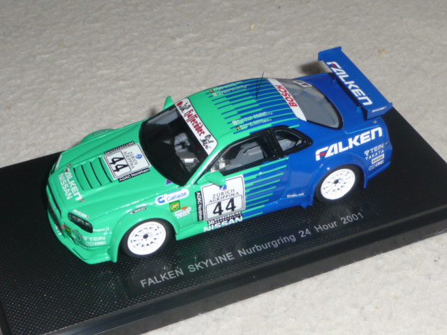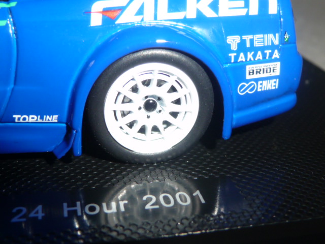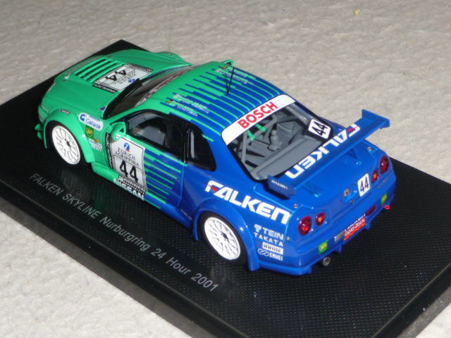 La partecipazione alla gara fu ugualmente importante, perché da lì in poi il team Falken tornò puntualmente ogni anno alla 24 Ore del Nurburgring con versioni della Skyline sempre più competitive e a loro agio sulla pista dell\’Eifel. Nel 2005 la Skyline Falken sfiorò il colpo grosso, issandosi al secondo posto alle 7 del mattino, per poi finire rovinosamente la propria corsa all\’entrata dell\’Adenauer Forst, a causa del cedimento di un braccetto della sospensione. Tornando alla R34 del 2001, Ebbro ne ha recentemente fatto oggetto di una bella riproduzione in resina; le vetture degli anni successivi seguiranno, intanto concentriamoci su questo modello che offre parecchi motivi di interesse.
