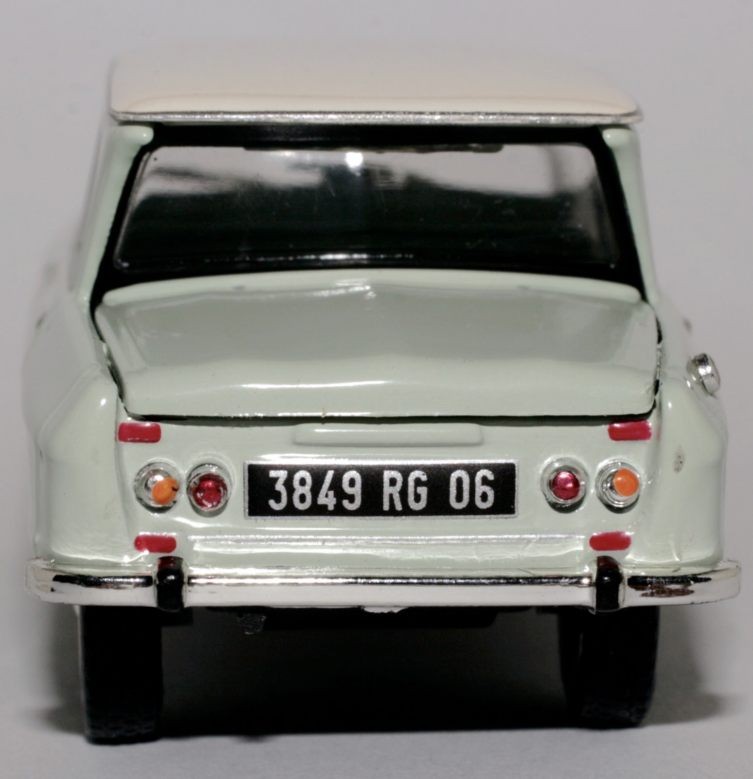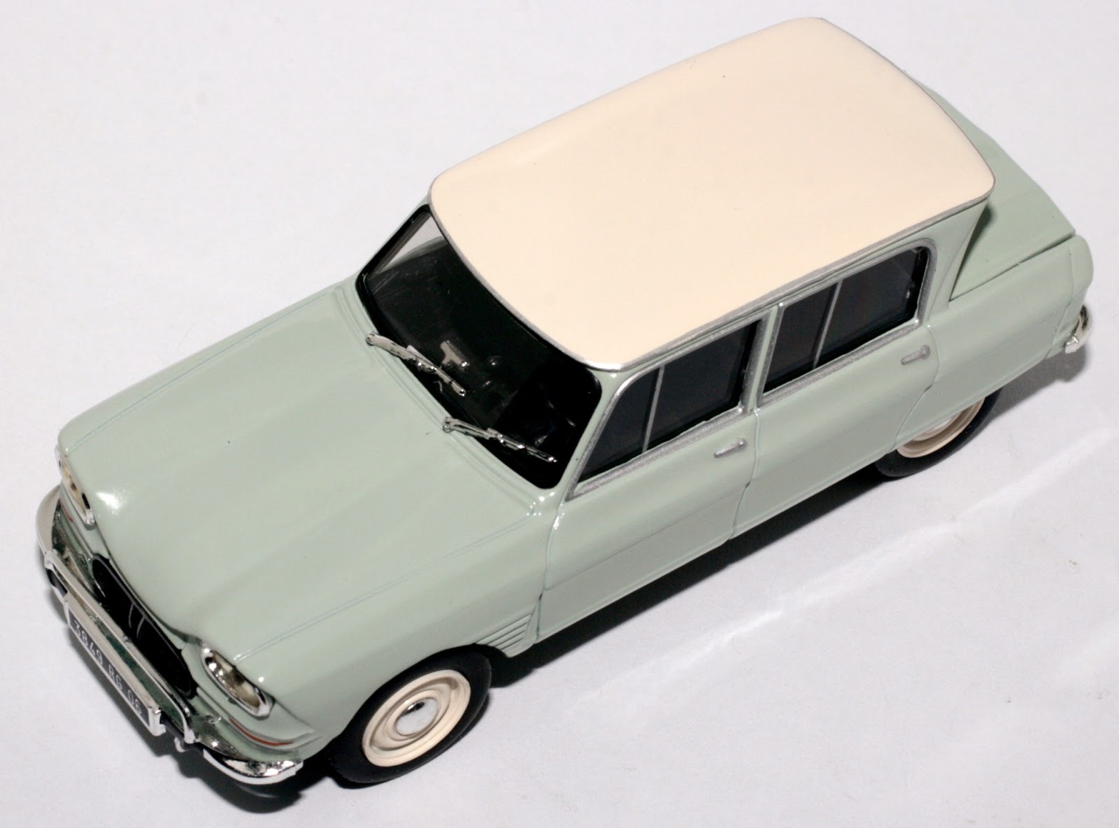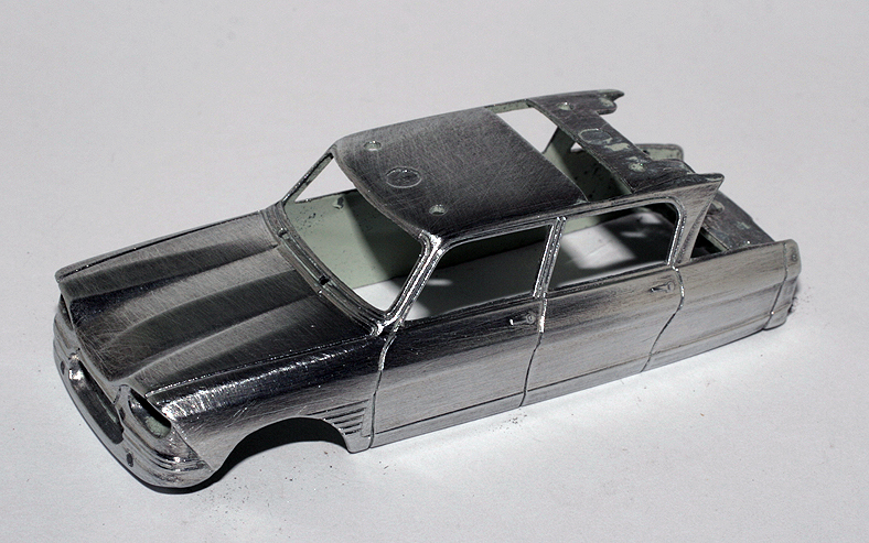 Contrariamente a quanto fatto per le Ferrari, in questo caso è stato necessario riverniciare il modello, dato che la base prevedeva un\’AMI 6 verdina con tetto beige. L\’operazione di separazione dei vari particolari è facile. Il tetto ed il cofano posteriore sono stampati in plastica e rapportati, non è il caso di togliere la vernice di base, basta una bella levigatura con carta seppia e si passa subito in carrozzeria.