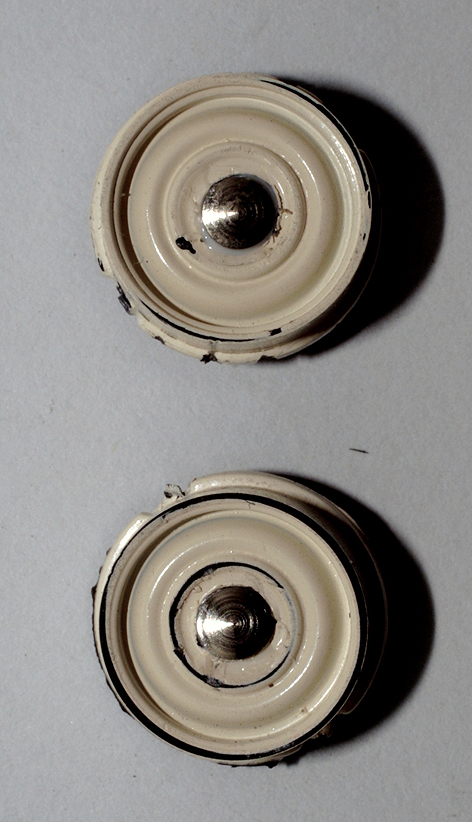 | Il cerchio d\’origine appena liberato dalla coppa centrale. A destra l\’inserto in metallo che andrà incollato al centro. |