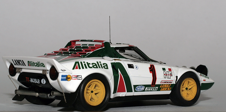 Se notate guardando le fotografie, la nostra Stratos soffriva di scarpe che tingono. Capita, i cinesi ancora ignoravano che un certo tipo di vernice mal si adatta al materiale con cui sono realizzate le gomme. Ne abbiamo approfittato per ridipingere i cerchi con smalto opaco sintetico, l\’unico in grado di metterci al riparo da sgradevoli fioriture postume e, già che eravamo per strada, abbiamo calzato delle PIrelli tassellate, più indicate delle slick d\’origine. I fermacofano sono solo tampografati, largo quindi ad altri fotoincisi, mentre il tergicristallo in plastica va rimpiazzato vantaggiosamente con  un altro particolare sempre fotoinciso. Analoga sorte per i coperchi dei tappi carburante, rivisti e  corretti poi dipinti in bianco lucido. Esternamente, le luci di retromarcia sono ora firmate Adami (noblesse oblige) i paraspruzzi sono completati da una catenella di sostegno ed ancora, i terminali di scarico in plastica sono rimpiazzati da connettori elettrici, capaci di regalare miracoli ottici!