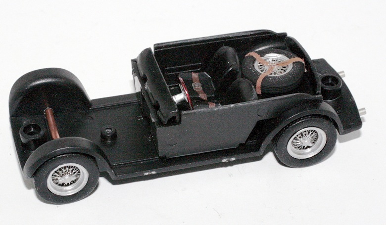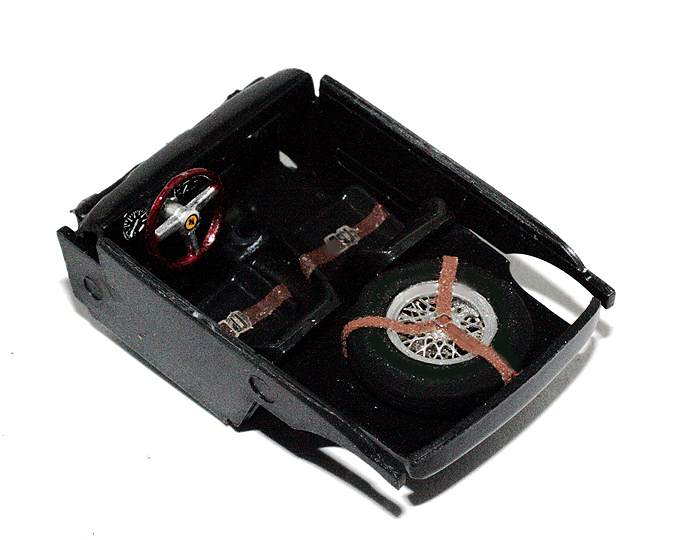 Muniti di pasta lucidante, abbiamo provveduto a lucidare la carrozzeria, al vero già piuttosto in ordine. Internamente, sui sedili abbiamo montato le cinture di sicurezza obbligatorie per regolamento, al centro del padiglione va inserito lo specchietto retrovisore, quest\’ultimo fotoinciso come le fibbie delle cinture e della cinghia che fissa la ruota di scorta. Il volante è ora con corona in legno e con razze di colore alluminio.