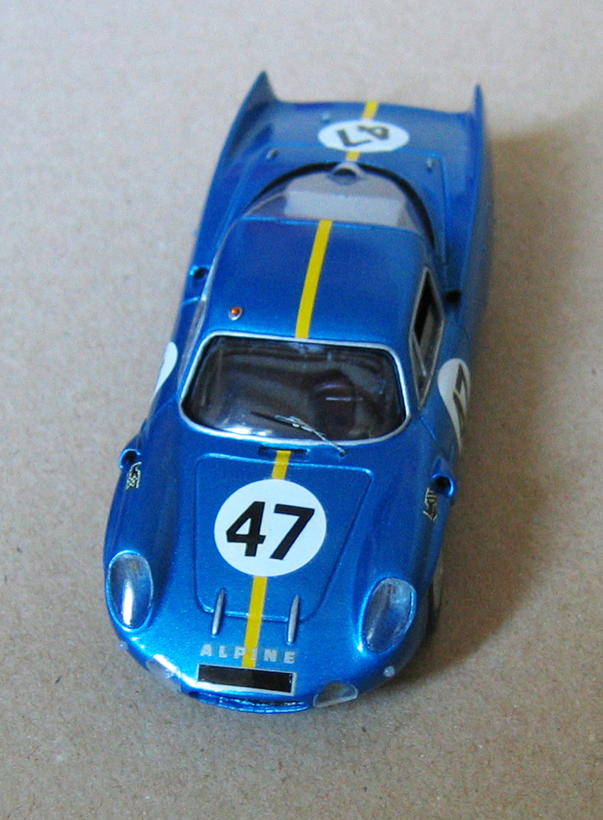 Tout semble fait avec le service minimum : la reproduction du châssis, sa fixation à la caisse, le compartiment moteur, le plancher, et certains détails sur la caisse. Mais même si la carrosserie accuse un manque de longueur de près de 4mm, l’allure est assez bien représentée…reste mon interprétation des carénages de roues pour cette numéro 47…j’avoue encore garder un tout petit doute, mais à la vue des 2 seuls documents d’époque que l’on trouve sur le Net, et qui montre la voiture à ce niveau, je ne suis pas trop inquiet. Je me suis lancé après avoir proposé la modification à David…qui m’a fait confiance. Bien des personnes doivent posséder des photos de cette Alpine 47…si l’une d’elles lit ceci un jour, j’espère que je ne passerai pas pour un âne !