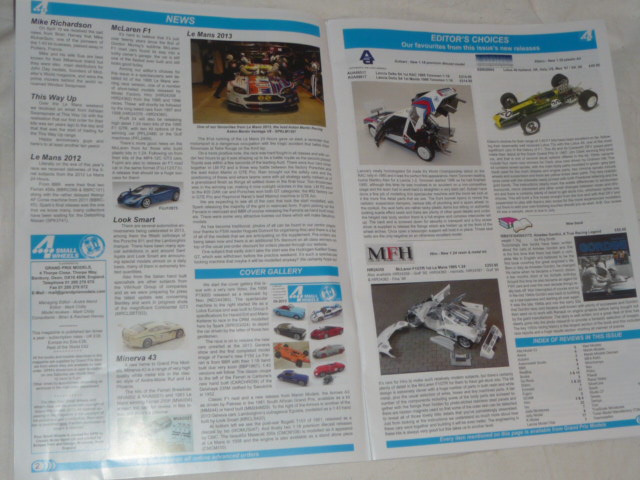 Questo mese, la \”editor\’s choice\” verte su soggetti ormai abbastanza conosciuti (la Delta S4 di AutoArt in 1:18 e il kit in 1:20 della Lotus 49 a opera di Ebbro), ma anche sulla bellissima McLaren F1GTR di MFH (kit scala 1:24) e su un libro di Roy Smith, dedicato ad Amedeo Gordini, un personaggio che stranamente nella produzione editoriale vecchia e nuova non ha mai goduto della popolarità di altri protagonisti dei suoi tempi. Il resto è la solita raffica di novità, con recensioni abbastanza accurate, opera di un Mark Chitty quasi sempre molto attento, preciso e documentato.