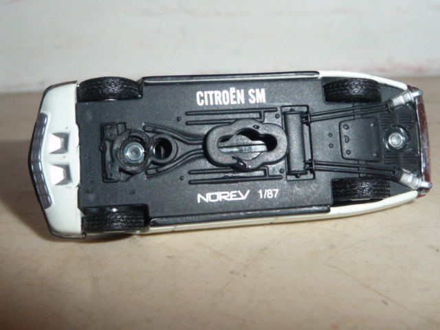 | Pur essendo commercializzata nella ben nota scatolina trasparente senza basetta, la SM di Norev presenta un fondino sul quale è previsto un fissaggio centrale. Il nome del fabbricante e della vettura sono semplicemente tampografati (per questioni di economie di scala?). Il fondino è fissato alla carrozzeria mediante due rivetti. |