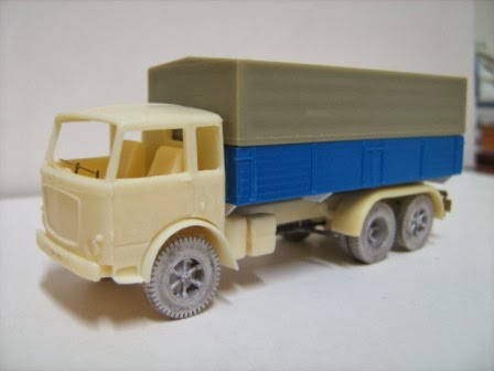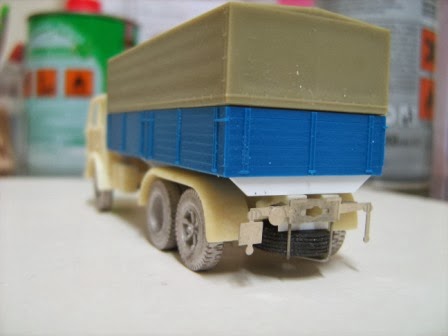 Verniciatura a bomboletta, finitura lucida per la cabina e opaca per telaio e allestimento. Sporcatura del telone realizzata a pennello con colori acrilici Tamiya e polvere di gessetto bianco.