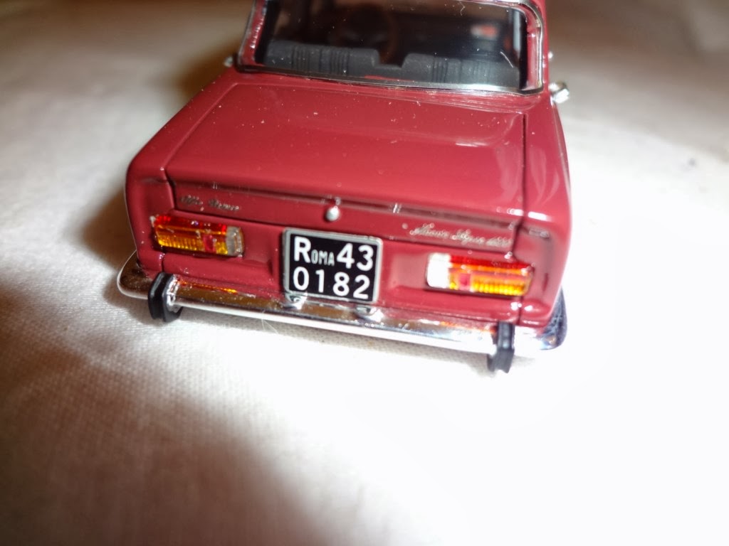Belli, come in tutta la produzione Kess, i gruppi ottici posteriori. Le scritte Alfa Romeo Giulia Super 1300 (o 1600) sono fotoincise e applicate con grande cura. Purtroppo la targa è totalmente di fantasia e richiama il numero di catalogo del modello…