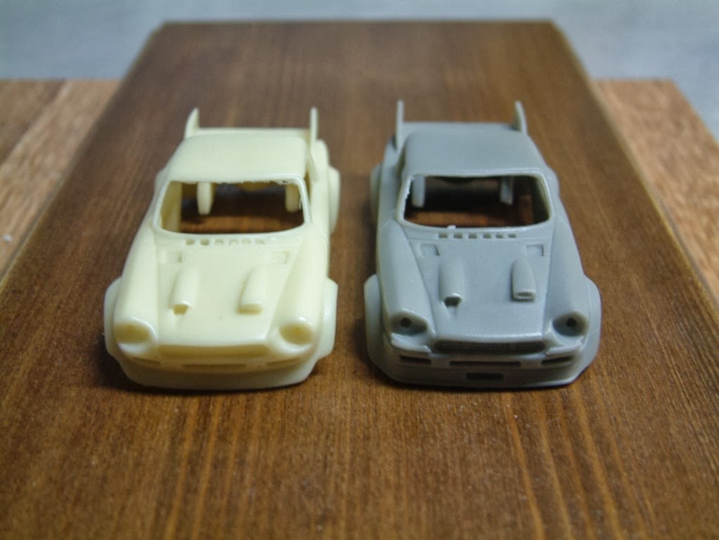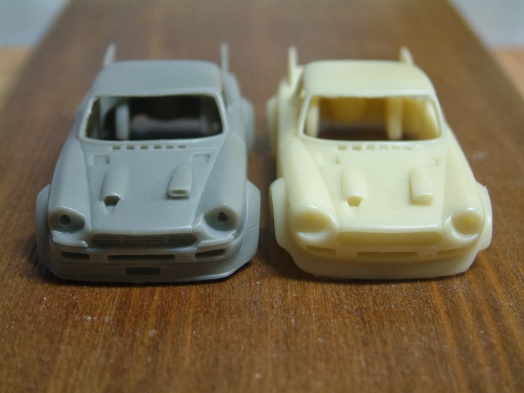 | A sinistra, il nuovo modello Carrara; l\’anteriore del vecchio kit Barnini era completamente da rivedere, complice una documentazione all\’epoca ancora molto approssimativa. Notare l\’assenza nel modello Barnini della presa d\’aria sulla lama inferiore, oltre ad altre piccole differenze. |