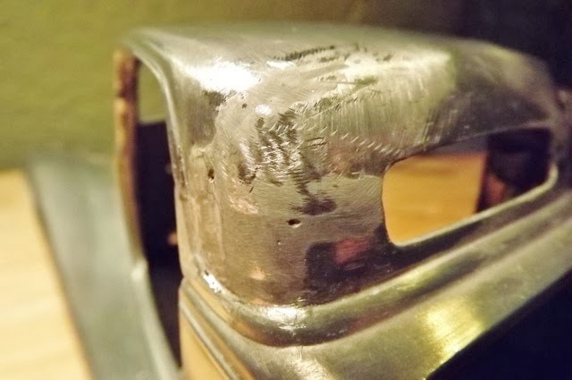 Using pie cuts and other metal bending techniques and two tops, we obtained the correct top height and profile and then filled the cuts in with JB Weld, an epoxy filler. To get unchopped doors, the donor model\’s doors were cut and pinned and a copper wire used to outline the door\’s window, epoxied in place for structural rigidity. You can see the rough filing marks that were later filled in with automotive primer surfacer, a very thick lacquer primer.