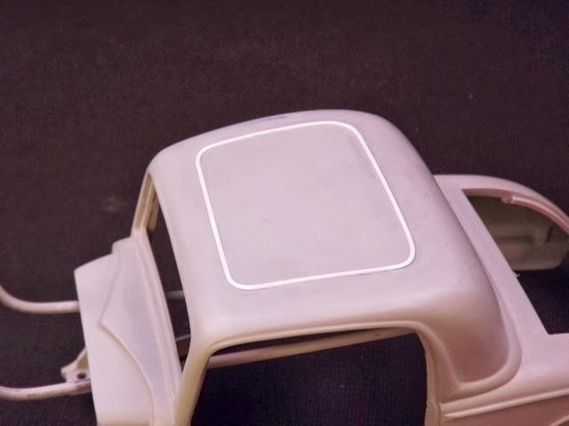 In this last picture, 2 mm plastic stock was heated and bent for the frame outline of the fabric top insert. It will be precision masked and painted flat black after I paint the model in a gloss black color.