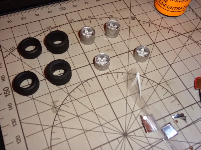 | Già smontato il modello; al posto delle ruote in plastica – ormai abbastanza datate – ho deciso di impiegare dei cerchi in metallo bianco di Carrara Models. I bellissimi cerchi Madyero (W107) mi sono sembrati un po\’ troppo dettagliati per un modello di questo tipo. |