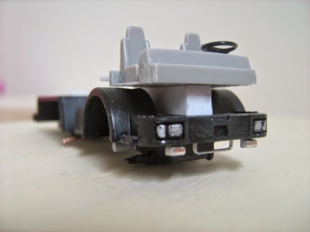 Cabina allestita con interni Herpa, vetri in acetato, copertina in tessuto. Mascherina decorata con fotoincisioni G&G Rail. Specchietti laterali sempre in fotoincisione.