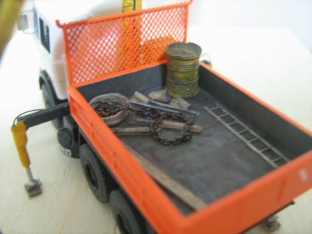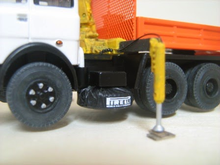Base di partenza il solito camion Fiat di Lima. Telaio completato con parti Herpa e Kibri. Montata la cassa batteria, il filtro aria e la gomma di scorta completa di telone.