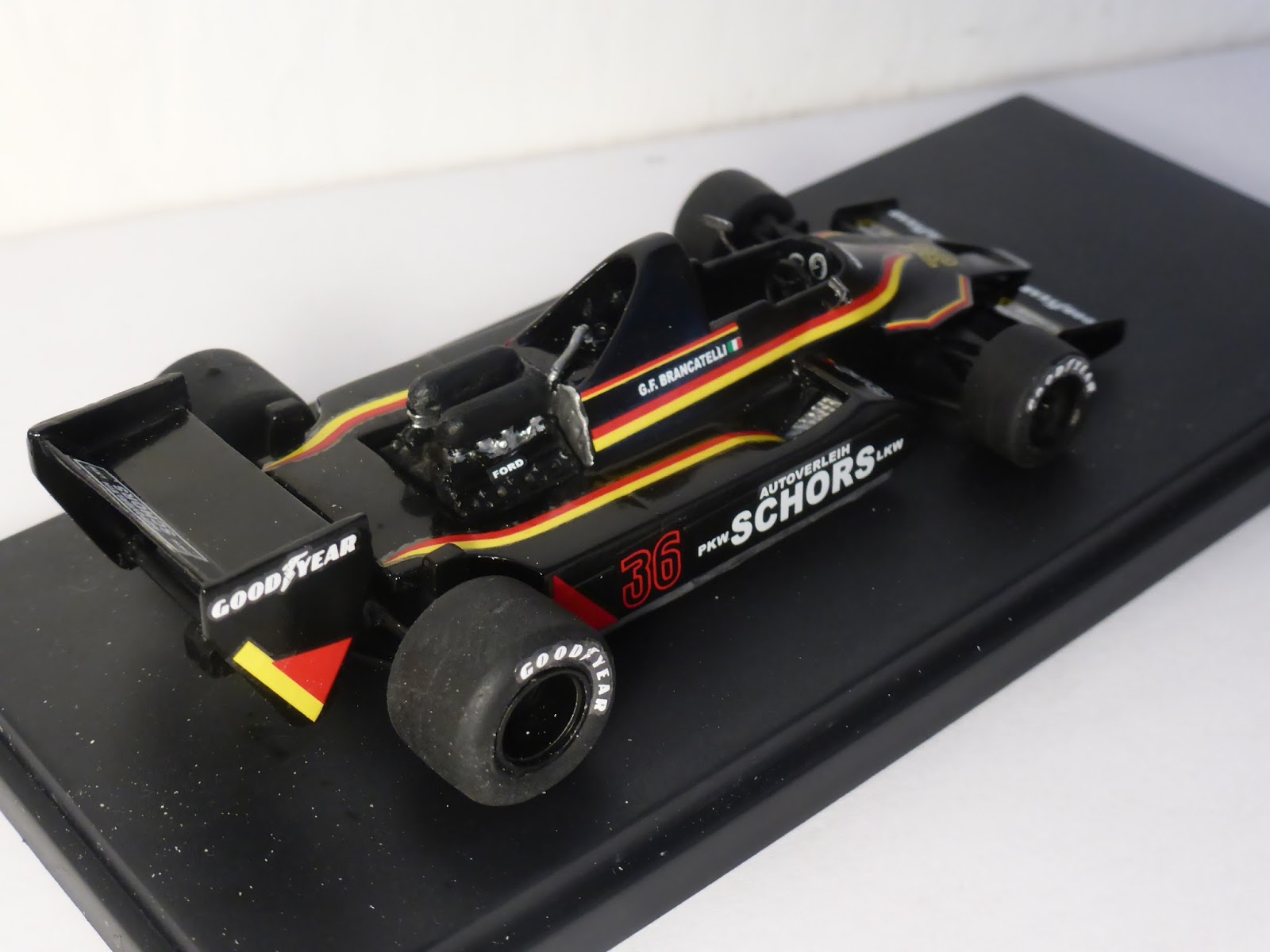 Il modello CP è in resina con parti in metallo bianco, e dà l\’impressione di un\’ottima solidità, cosa abbastanza rara quando ci si trova di fronte a una riproduzione di una vettura di formula. Molto buona la verniciatura e accurata la posa delle decals della livrea Schors. Secondo me questi modelli acquistano un senso ancora maggiore esponendone in una vetrina un gruppo di dieci o quindici; è allora che essi sprigionano un fascino particolare, facendo apprezzare l\’evoluzione e la varietà delle linee della Formula 1 di quel periodo così vivace. I modelli sono disponibili sia come factory built (prezzo al pubblico circa 78 euro), sia come kit, a 45 euro. Si tratta di un rapporto qualità-prezzo molto invitante, e il kit consente tra l\’altro elaborazioni più o meno spinte, tollerando benissimo trasformazioni anche molto radicali.
