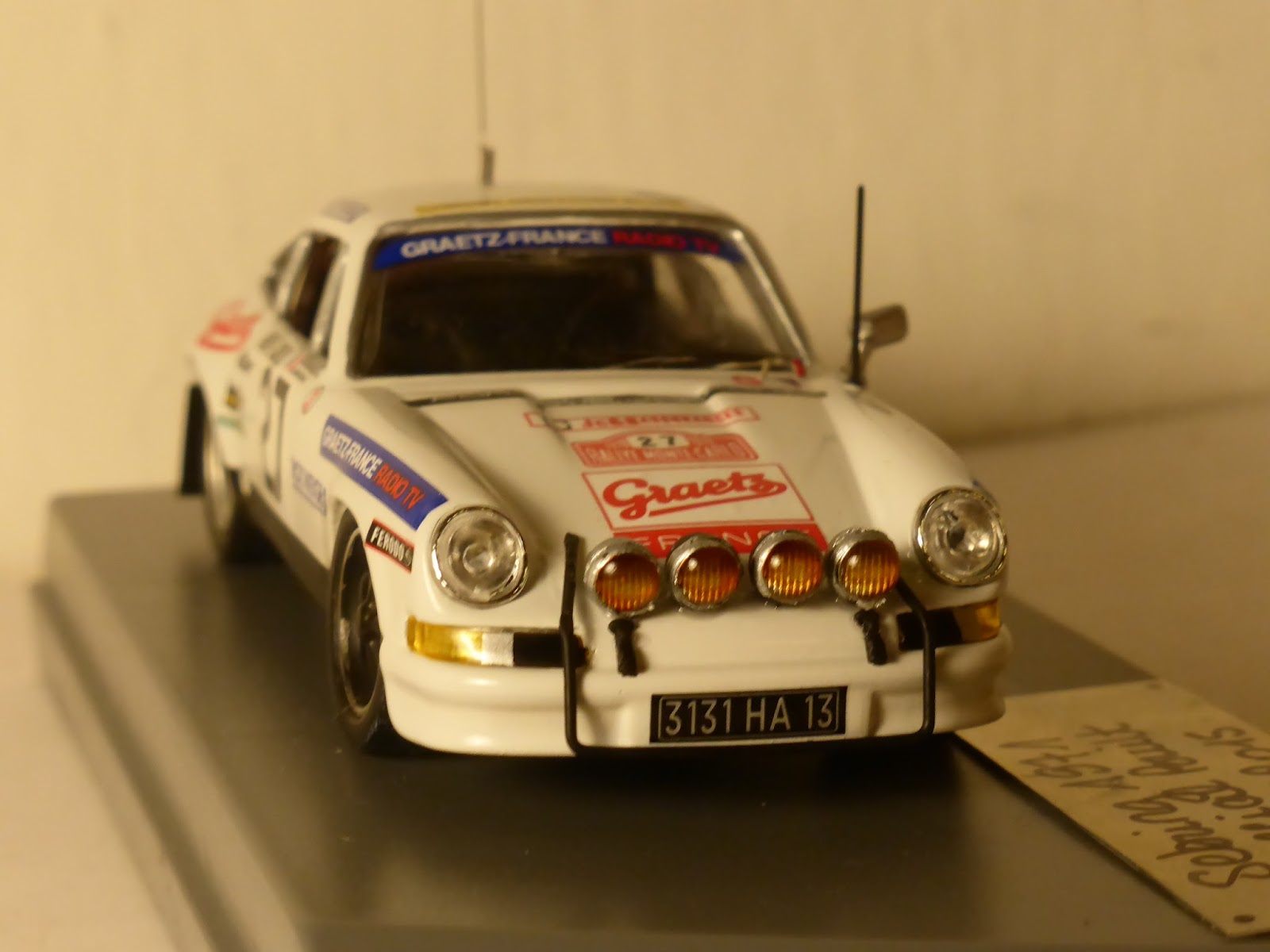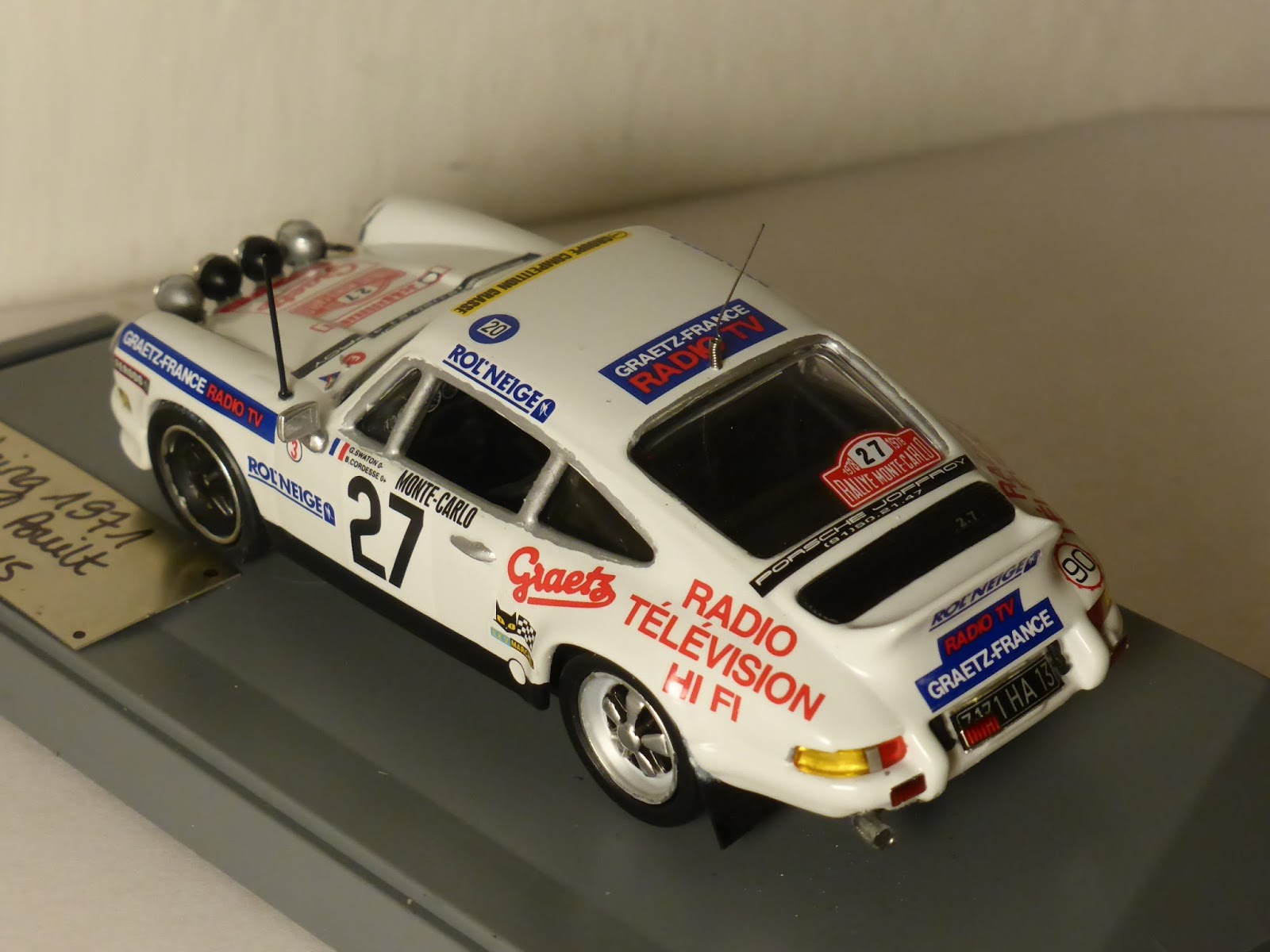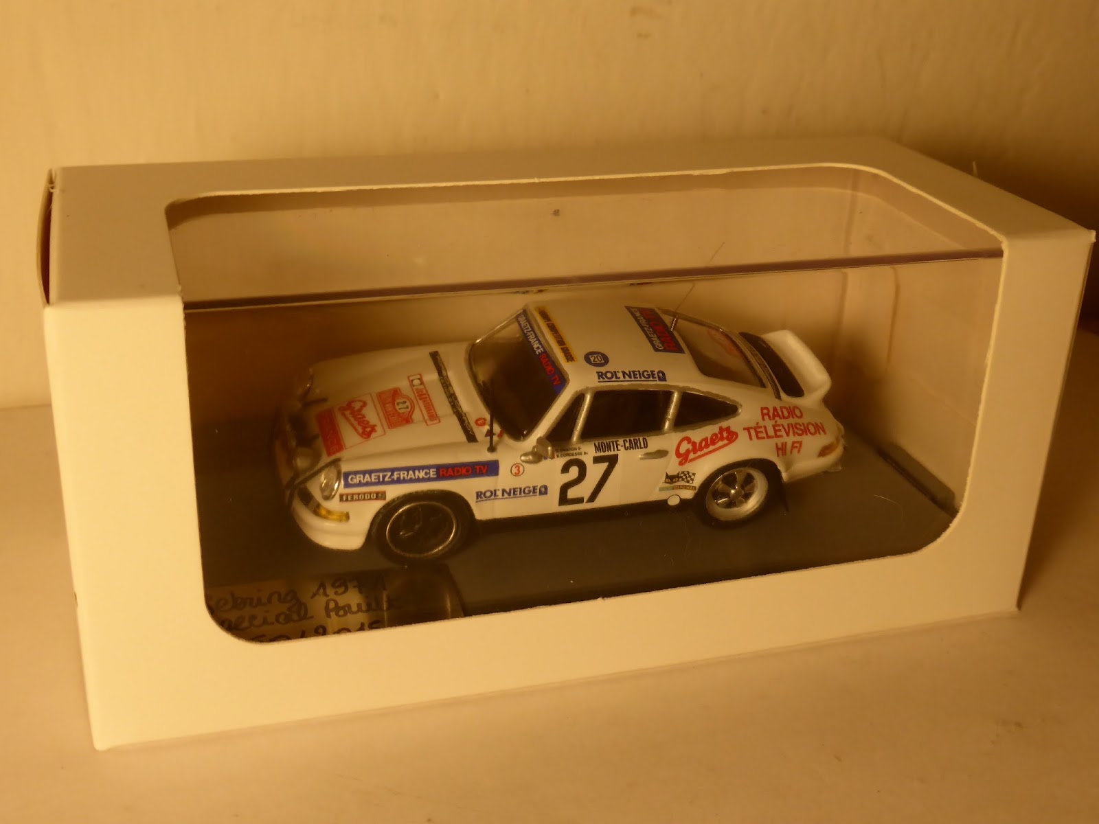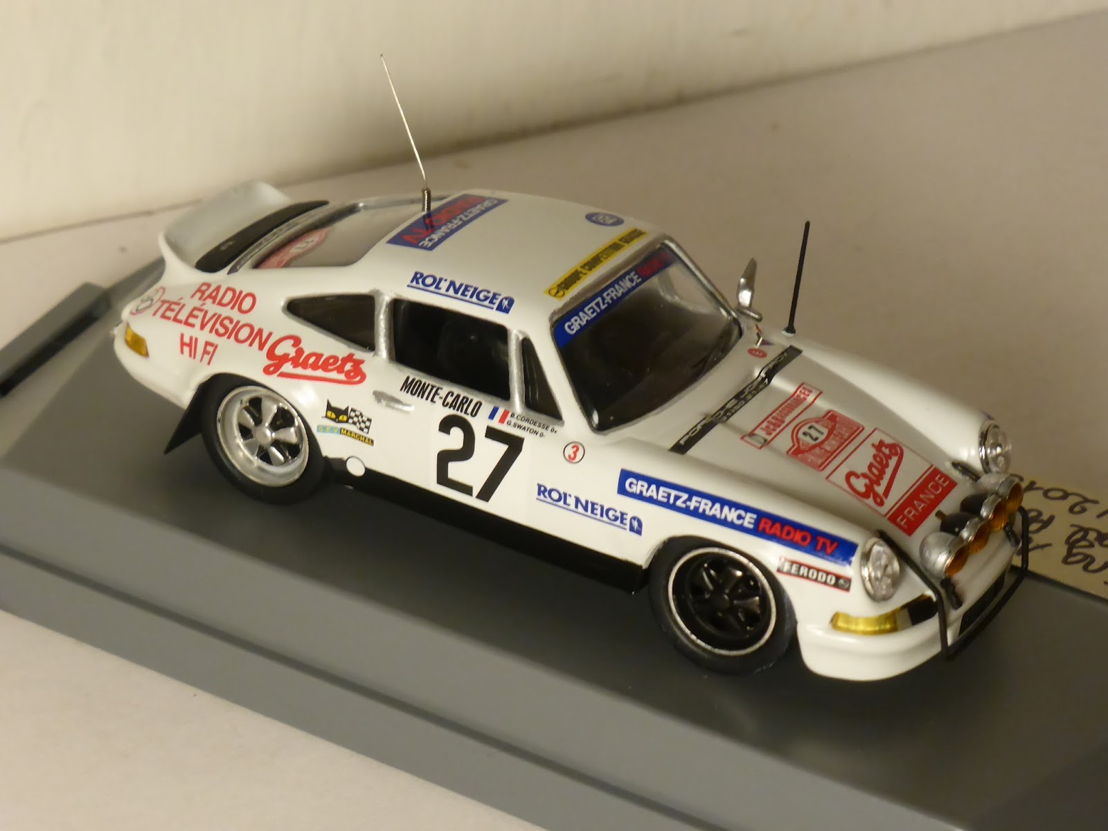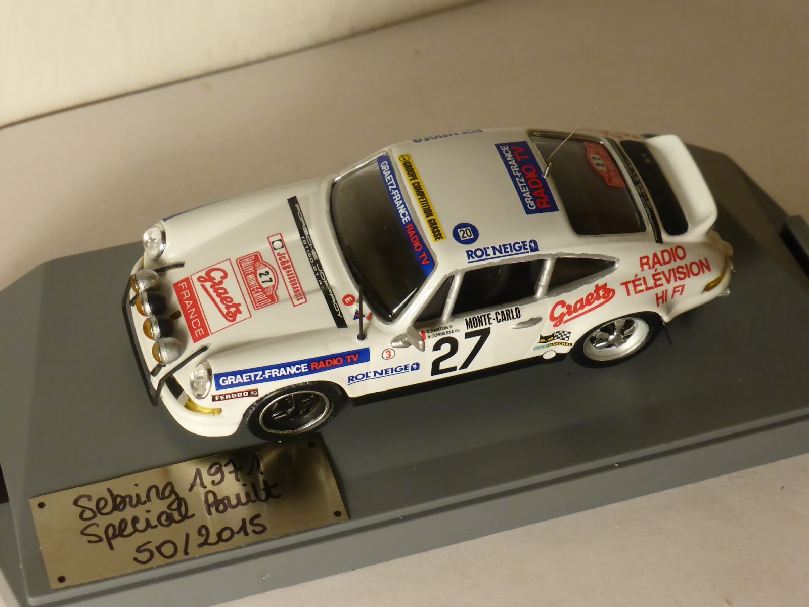 Nella serie limitata Sebring1971 (numero di serie 50/2015) è appena uscita un\’elaborazione su base diecast 1:43 KDW, realizzata con decals Arena e l\’aggiunta di diversi particolari anche autocostruiti. Si tratta della Porsche 911 Carrera RS Gr.3 Graetz di Swaton/Cordesse del Rally Montecarlo 1978. Sono circa 25 le modifiche apportate, incluso l\’abitacolo, con l\’aggiunta di sedili anatomici, rollbar, volante racing e strumentazione; autocostruita la struttura anteriore, aggiunti fendinebbia, ganci fermacofano in gomma, rifatta parte della fanaleria, staccabatteria, antenne ecc.