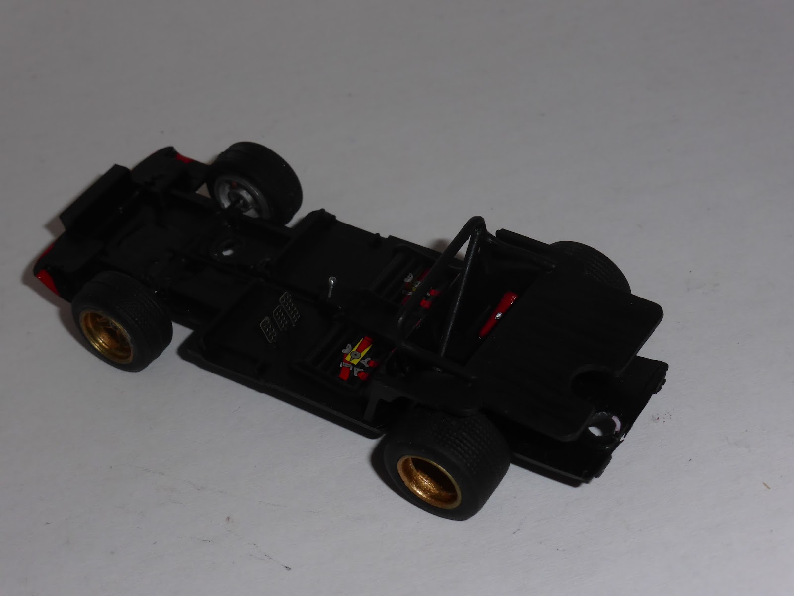 | Il telaio quasi completo: rollbar cui è stato aggiunto l\’elemento centrale obliquo, pedaliera in fotoincisione e estintore in metallo bianco. |