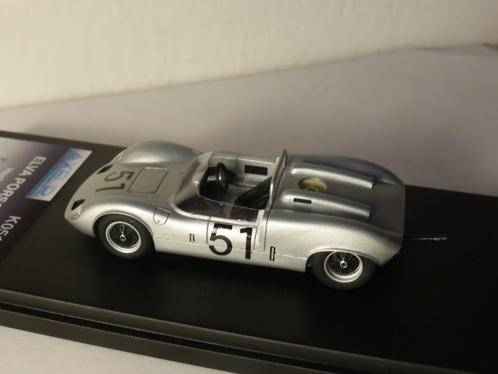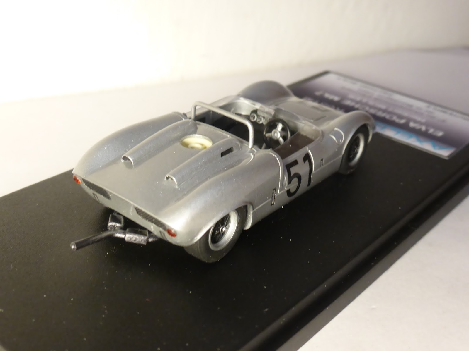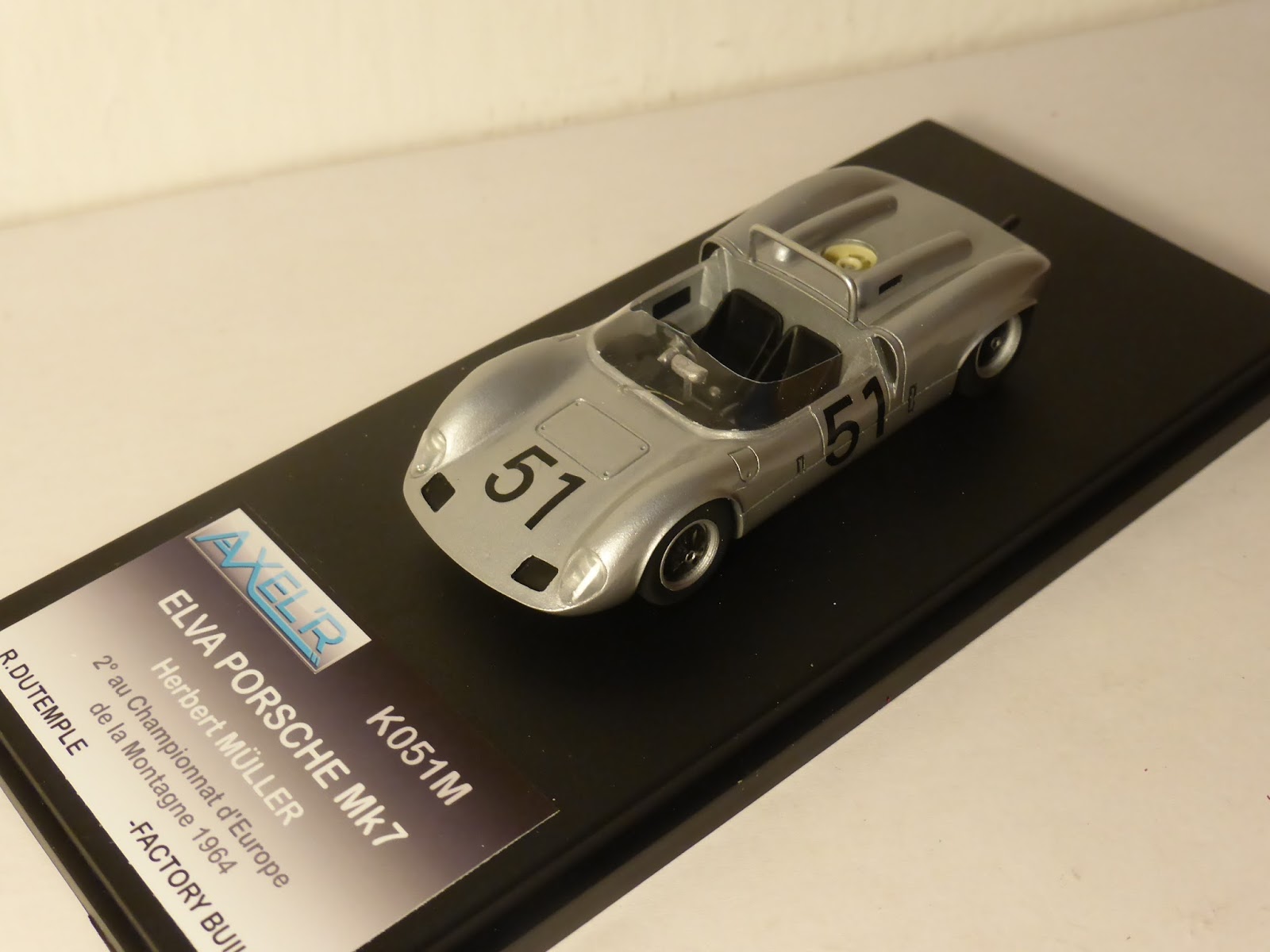 Non è una marca troppo conosciuta qui da noi, la Elva. Nei paesi anglosassoni lo è naturalmente molto di più e un libro uscito nel 2011 ad opera di Janos Wimpffen, edito da David Bull, ha contribuito a far chiarezza su molti punti della storia di un costruttore dalle tante sfaccettature. In Italia destò curiosità la partecipazione ad alcune prove per autostoriche di Roberto Benelli alla guida di un\’Elva bianca. In scala 1:43 le Elva si contano sulle dita di una mano, ma Roger Dutemple (Axel\’R, Francia) ha in catalogo alcune versioni, la più recente delle quali riveste un interesse particolare, trattandosi di una… Porsche ufficiale. La storia del telaio riprodotto ultimamente da Axel\’R è particolare: acquistato direttamente dalla casa tedesca (dovrebbe essere il numero 70P/038) venne abbinato al motore Porsche tipo 711 da 8 cilindri e 2000cc per competere nell\’Europeo della Montagna 1964. La vettura esordì al Rossfeld, in Germania, il 7 giugno con Edgar Barth: fu la prima volta di un telaio non-Porsche iscritto ufficialmente da Stoccarda. Barth fu tutt\’altro che entusiasta del comportamento della macchina, o almeno così si disse. Sta di fatto che per il resto della stagione Barth ripiegò su una 718 RS Spyder, mentre l\’Elva-Porsche passò allo svizzero Herbert Mueller, che la guidò in qualche gara prima di passare anch\’egli a una Porsche, precisamente una 904/8 Spyder. Il modello riprodotto da Axel\’R (resina, scala 1:43) è disponibile sia in kit sia montato in serie estremamente limitata. Abbiamo avuto occasione di fotografare il factory built che è davvero un piccolo gioiello: verniciatura perfetta (l\’alluminio riprodotto in modo fine e equilibrato), montaggio pulito, assetto corretto che dà la perfetta idea del \”peso\” della vettura; insomma un modello che trasmette quell\’idea di realismo che a volte manca – e quando manca quella hai voglia ad aggiungere dettagli su dettagli. Questa Elva-Porsche è un pezzo importante in ogni collezione Porsche e di sport-prototipi. Un modello semplice ma \”serio\”, il cui montaggio è alla portata della maggior parte dei modellisti. Pieni voti quindi ad Axel\’R che continua sulla strada dei soggetti particolari, a caccia di perle rare, portando avanti la tradizione del modello speciale in resina.
