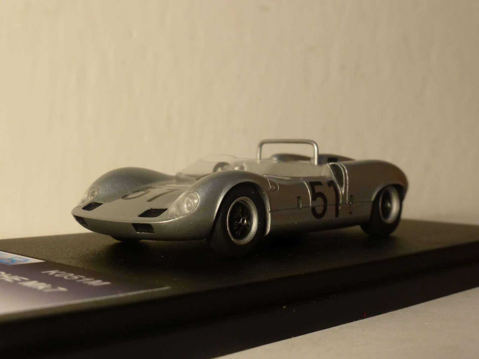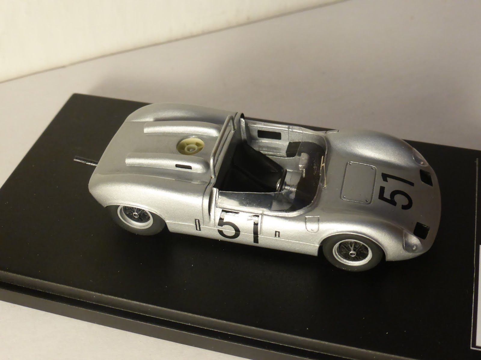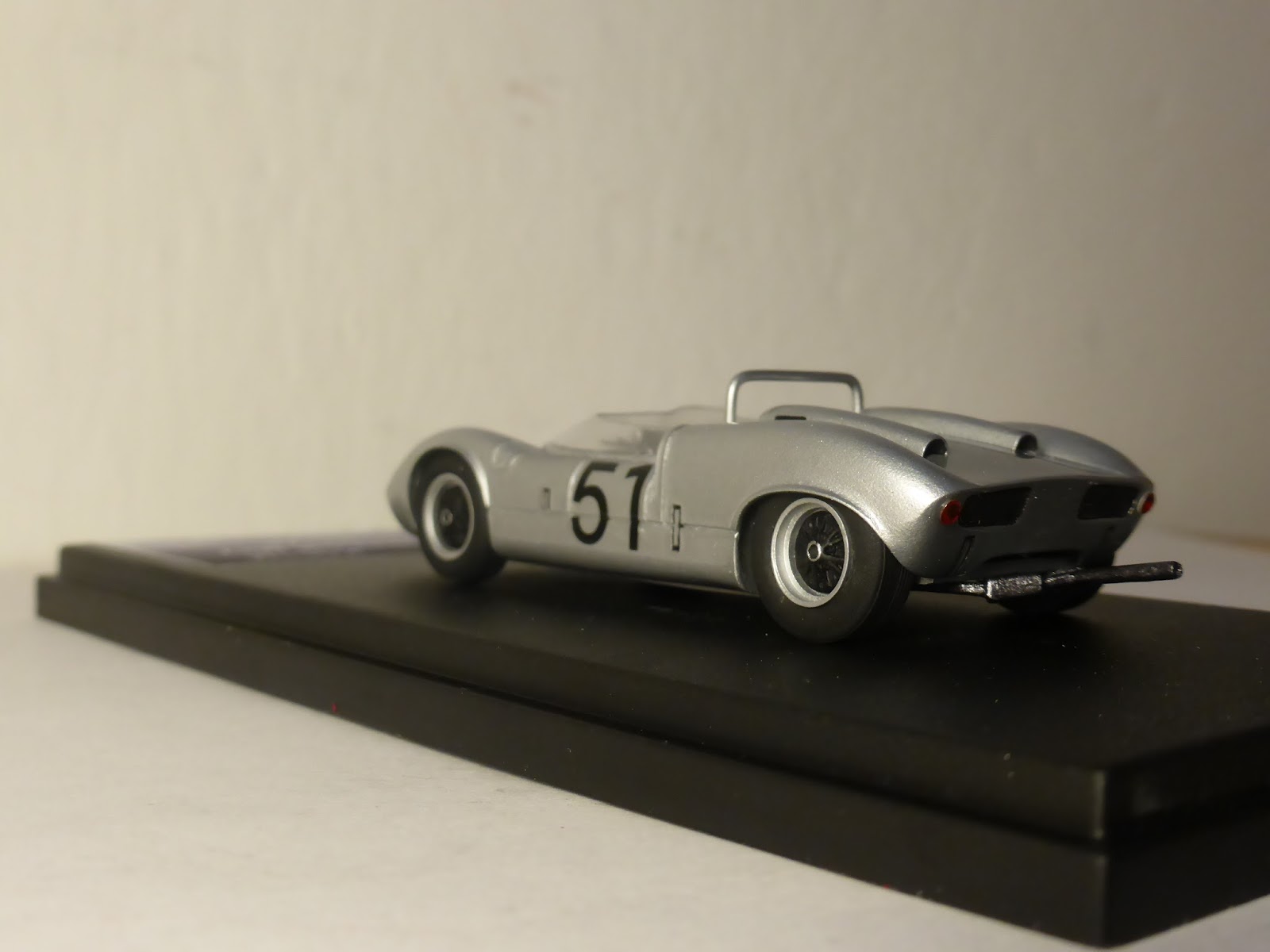 Non è una marca troppo conosciuta qui da noi, la Elva. Nei paesi anglosassoni lo è naturalmente molto di più e un libro uscito nel 2011 ad opera di Janos Wimpffen, edito da David Bull, ha contribuito a far chiarezza su molti punti della storia di un costruttore dalle tante sfaccettature. In Italia destò curiosità la partecipazione ad alcune prove per autostoriche di Roberto Benelli alla guida di un\’Elva bianca. In scala 1:43 le Elva si contano sulle dita di una mano, ma Roger Dutemple (Axel\’R, Francia) ha in catalogo alcune versioni, la più recente delle quali riveste un interesse particolare, trattandosi di una… Porsche ufficiale. La storia del telaio riprodotto ultimamente da Axel\’R è particolare: acquistato direttamente dalla casa tedesca (dovrebbe essere il numero 70P/038) venne abbinato al motore Porsche tipo 711 da 8 cilindri e 2000cc per competere nell\’Europeo della Montagna 1964. La vettura esordì al Rossfeld, in Germania, il 7 giugno con Edgar Barth: fu la prima volta di un telaio non-Porsche iscritto ufficialmente da Stoccarda. Barth fu tutt\’altro che entusiasta del comportamento della macchina, o almeno così si disse. Sta di fatto che per il resto della stagione Barth ripiegò su una 718 RS Spyder, mentre l\’Elva-Porsche passò allo svizzero Herbert Mueller, che la guidò in qualche gara prima di passare anch\’egli a una Porsche, precisamente una 904/8 Spyder. Il modello riprodotto da Axel\’R (resina, scala 1:43) è disponibile sia in kit sia montato in serie estremamente limitata. Abbiamo avuto occasione di fotografare il factory built che è davvero un piccolo gioiello: verniciatura perfetta (l\’alluminio riprodotto in modo fine e equilibrato), montaggio pulito, assetto corretto che dà la perfetta idea del \”peso\” della vettura; insomma un modello che trasmette quell\’idea di realismo che a volte manca – e quando manca quella hai voglia ad aggiungere dettagli su dettagli. Questa Elva-Porsche è un pezzo importante in ogni collezione Porsche e di sport-prototipi. Un modello semplice ma \”serio\”, il cui montaggio è alla portata della maggior parte dei modellisti. Pieni voti quindi ad Axel\’R che continua sulla strada dei soggetti particolari, a caccia di perle rare, portando avanti la tradizione del modello speciale in resina.