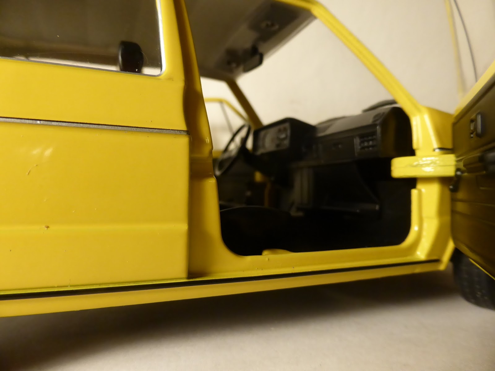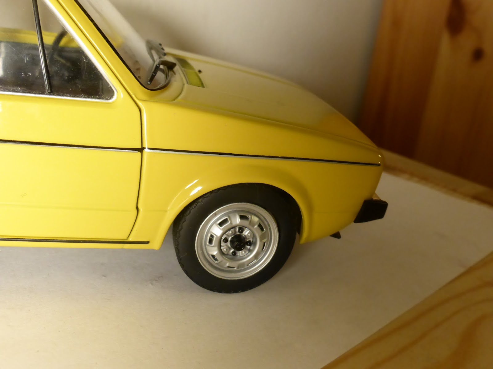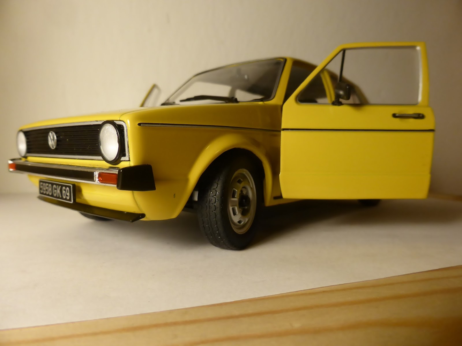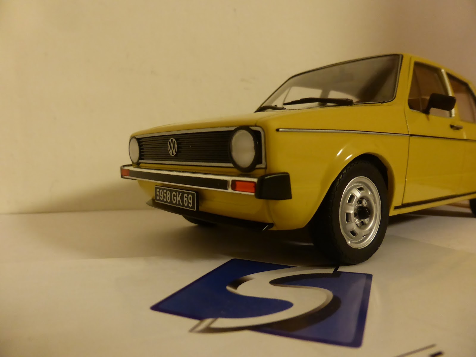 Solido ha riprodotto la Golf L 5 porte in due colorazioni, un giallo carico (art. S1800103) e un verde medio (S1800203). E\’ un modello dotato di due aperture (le sole porte anteriori), ruote sterzanti e un ottimo equilibrio generale, fra particolari in plastica riportati, verniciatura brillante e uniforme, e ovviamente fedeltà di linee e proporzioni. Apprezzabili molti dettagli quali le ruote, i gruppi ottici, le tampografie a simulare contorni vetri e fregi laterali, interni sufficientemente trattati. Per 40 euro non si può pretendere la luna e gli inizi di questa nuova gamma sono promettenti.