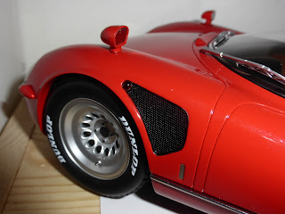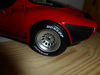 Come le griglie posteriori, anche le anteriori sono in fotoincisione. Eccellente la riproduzione degli specchietti, con parte riflettente. I cerchi, pur essendo in plastica, hanno una resa soddisfacente. Non manca la riproduzione della valvola di gonfiaggio, indispensabile in una scala come questa. |