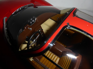 L\’esemplare prescelto per la riproduzione ha un solo faro per parte e ha un fregio anteriore, assente su molte vetture. I coprifari sono in acetato piuttosto spesso. Le cornici sono fotoincise, mentre altri particolari sono in plastica cromata. La pulizia del montaggio è di altissimo livello. Su questo esemplare si notano solo delle piccole tracce di colla sul coprifaro lato guida. |