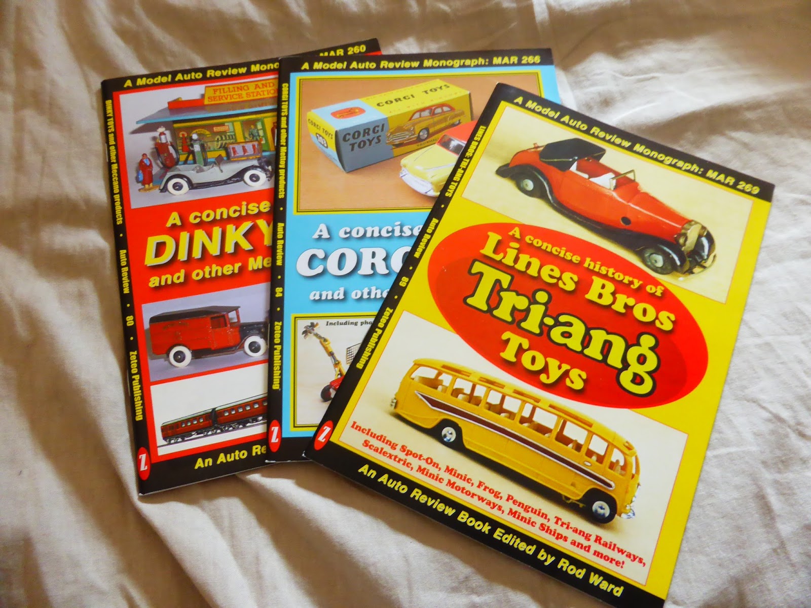 Della collana Auto Review Book, diretta da Rod Ward, il fondatore del negozio Modelauto di Leeds, avevo già parlato in un post del 2014 (se interessa, ecco il link: http://grandiepiccoleauto.blogspot.it/2014/03/una-certa-scuola-inglese-auto-review.html ). Vorrei tornare sull\’argomento, ora che anche il negozio on line ha chiuso – anni dopo la fine del negozio \”vero\” di Leeds. Anche Modelauto Review, la rivista, non esiste più da tempo in forma cartacea, ma per fortuna sopravvive nella versione on line. Resiste invece, per l\’appunto, la collana Auto Review Book, dedicata essenzialmente alle auto reali, ma non mancano qua e là felici eccezioni. Si tratta di quaderni di 32 pagine, in formato A5, con un layout tipicamente britannico, che piacerà ai più raffinati. Nel link che ho riportato sopra leggete di un paio di titoli particolarmente intriganti; in questa sede, invece, vi segnalo altri tre volumetti che stanno bene insieme, visto che la storia dei tre marchi trattati – Corgi, Dinky Toys e Lines Bros Tri-Ang – si è spesso intrecciata e sovrapposta nel corso dei decenni. Su Corgi e Dinky è stato scritto molto e la documentazione anche specialistica è abbondante: questi due quaderni, tuttavia, costituiscono un\’utile aggiunta di qualche foto inedita e possono essere una buona base di partenza per quei neofiti che vogliano affrontare l\’argomento in modo serio e documentato. Il titolo sulla Tri-Ang è forse il più interessante dei tre, perché copre alcuni marchi meno conosciuti (Minic, Frog, Penguin), senza trascurare il loro brand forse più famoso tra i collezionisti di automodelli, Spot-On. Molto valida è la trattazione delle vicende societarie dei vari marchi, cosa che a volte si tende a trascurare, ma che resta importante anche per comprendere i perché di alcune scelte commerciali. Per il 2016 non sono annunciati ulteriori titoli a carattere modellistico, ma solo delle monografie su auto e aerei. Per comodità, riporto la lista dei volumi che interessano direttamente l\’ambito del modellismo e del collezionismo: