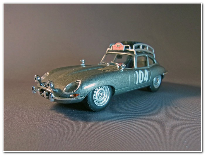 Segnalo questo interessante soggetto, anche perché raramente si vede una Jaguar E-Type da rally. Nell\’Atlas Jaguar Collection inglese è appena uscita la riproduzione della vettura di Roy Pinder e Charles Pollard che prese parte al Rally Montecarlo 1965, resa famosa da un filmato di British Pathe, che vi consiglio di guardare a prescindere da questo modello perché è a colori ed è davvero interessante: http://www.britishpathe.com/video/monty-carlo-rally-1965. In realtà già Arena aveva riprodotto questa versione della E-Type, con due ruote di scorta sul tetto a differenza del modello Atlas che ne ha solo una (come nel filmato). Ovviamente entrambe le configurazioni possono essere realistiche, considerata la lunghezza di un rally di quei tempi.
