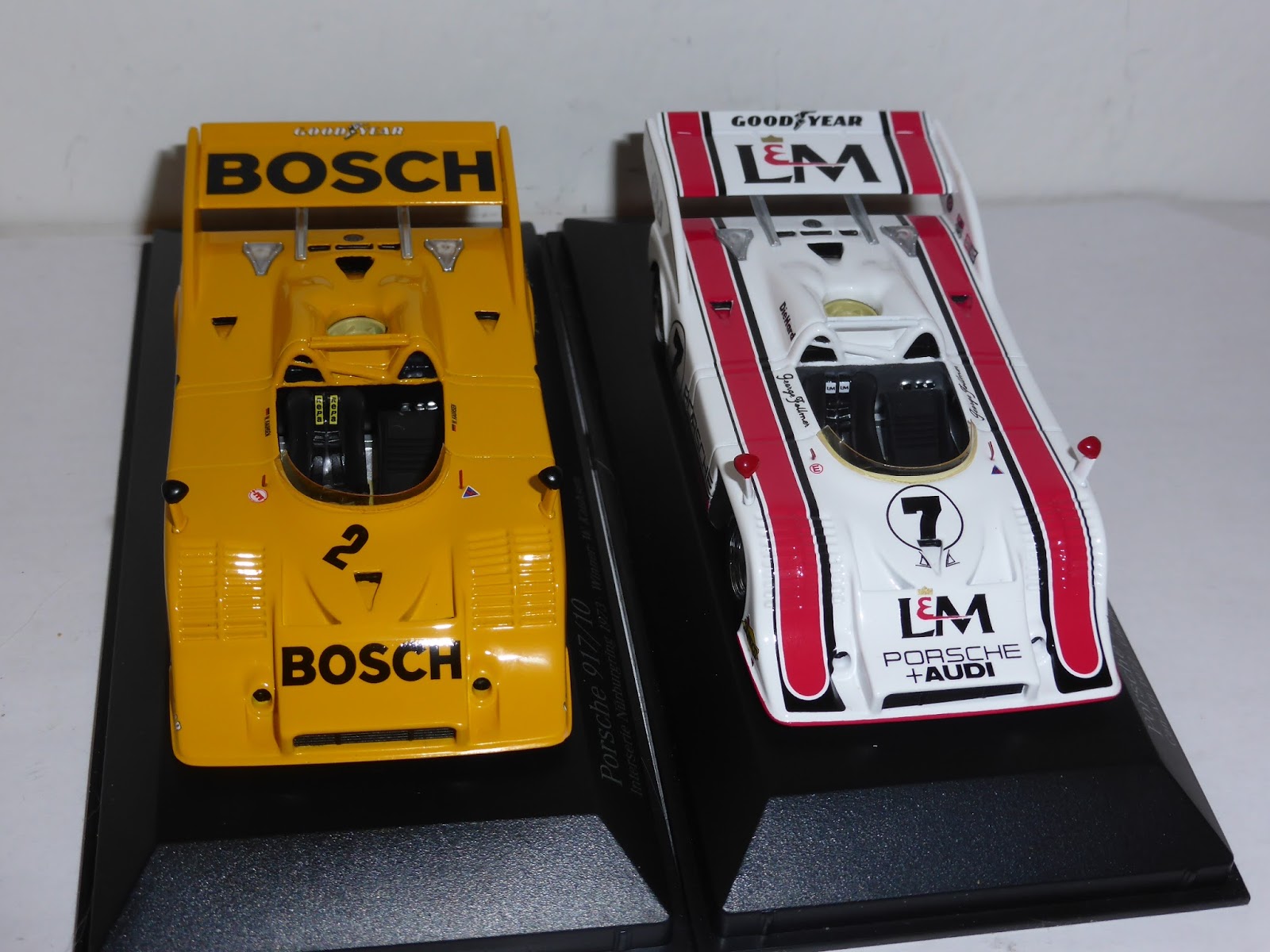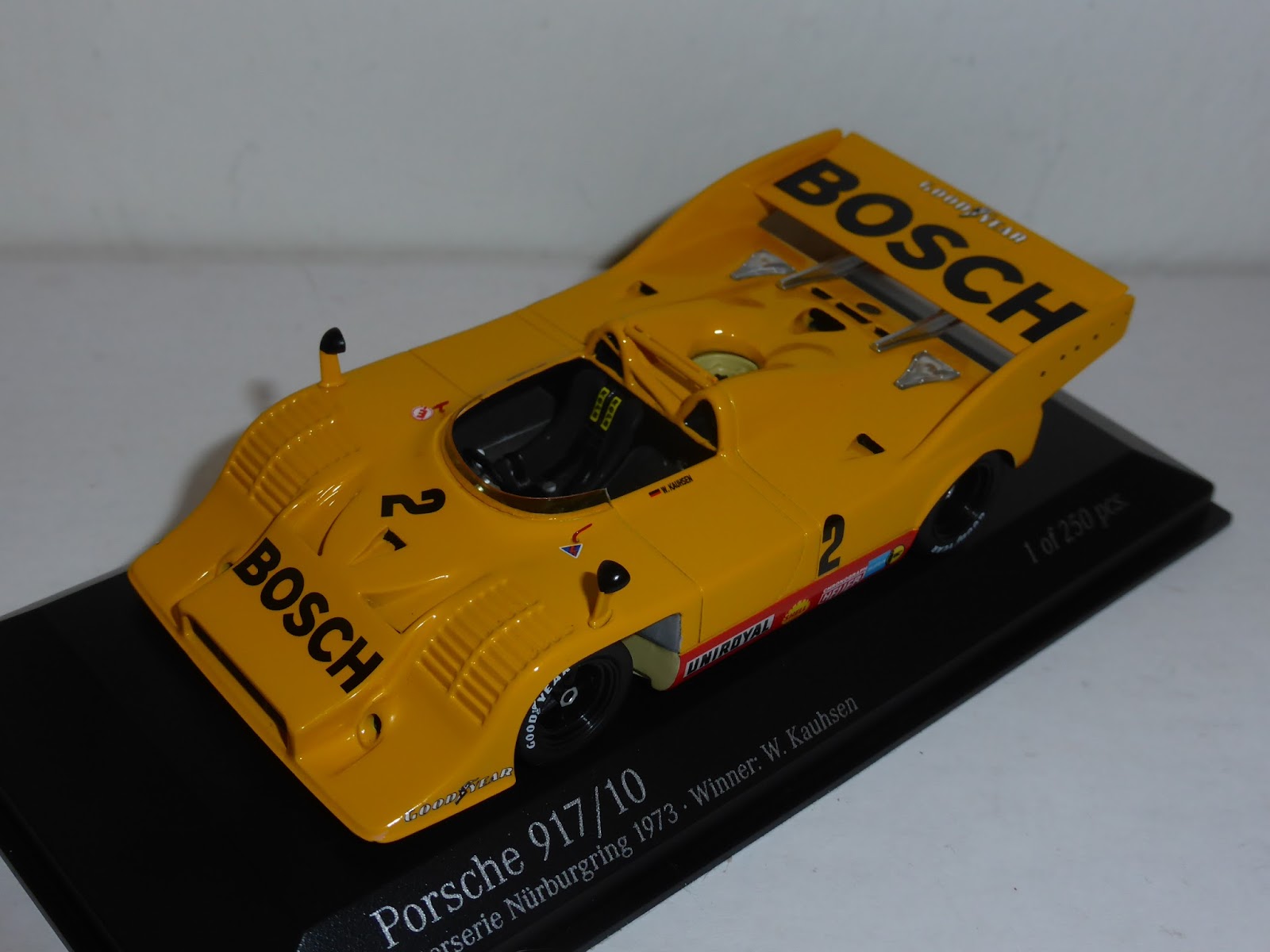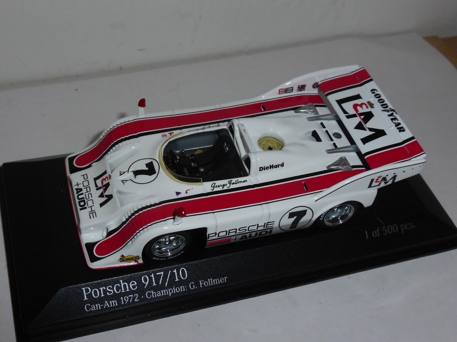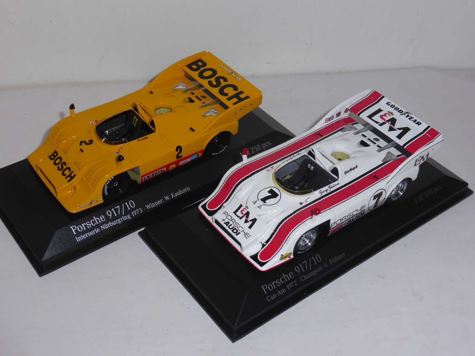Contemporaneamente alla 917/20 di cui leggete in questo link , Minichamps ha introdotto le prime due versioni della 917/10. Per questo modello valgono gli stessi giudizi formulati nell\’articolo sulla 917/20. Anche in questo caso le due referenze sono già esaurite presso Ripa: si tratta di due versioni particolarmente iconiche, la vincitrice della serie Can-Am 1972 con George Follmer e la vincente della gara del Nurburgring Interserie 1973 con Willi Kauhsen. La prima, in edizione limitata a 500 esemplari, è stata delle tre 917 di Minichamps quella che forse sorprendentemente ha riscosso il maggiore successo; la seconda ha la tiratura più bassa (250 pezzi) ed è la versione con meno appeal internazionale. Ecco una serie di immagini dei due modelli, cui senza dubbio farà seguito una nutrita messe di altre versioni (la 917/10 è una vettura ampiamente sfruttabile):