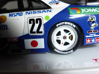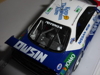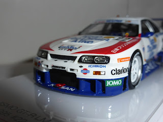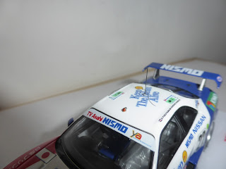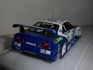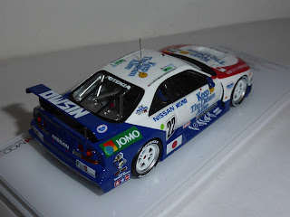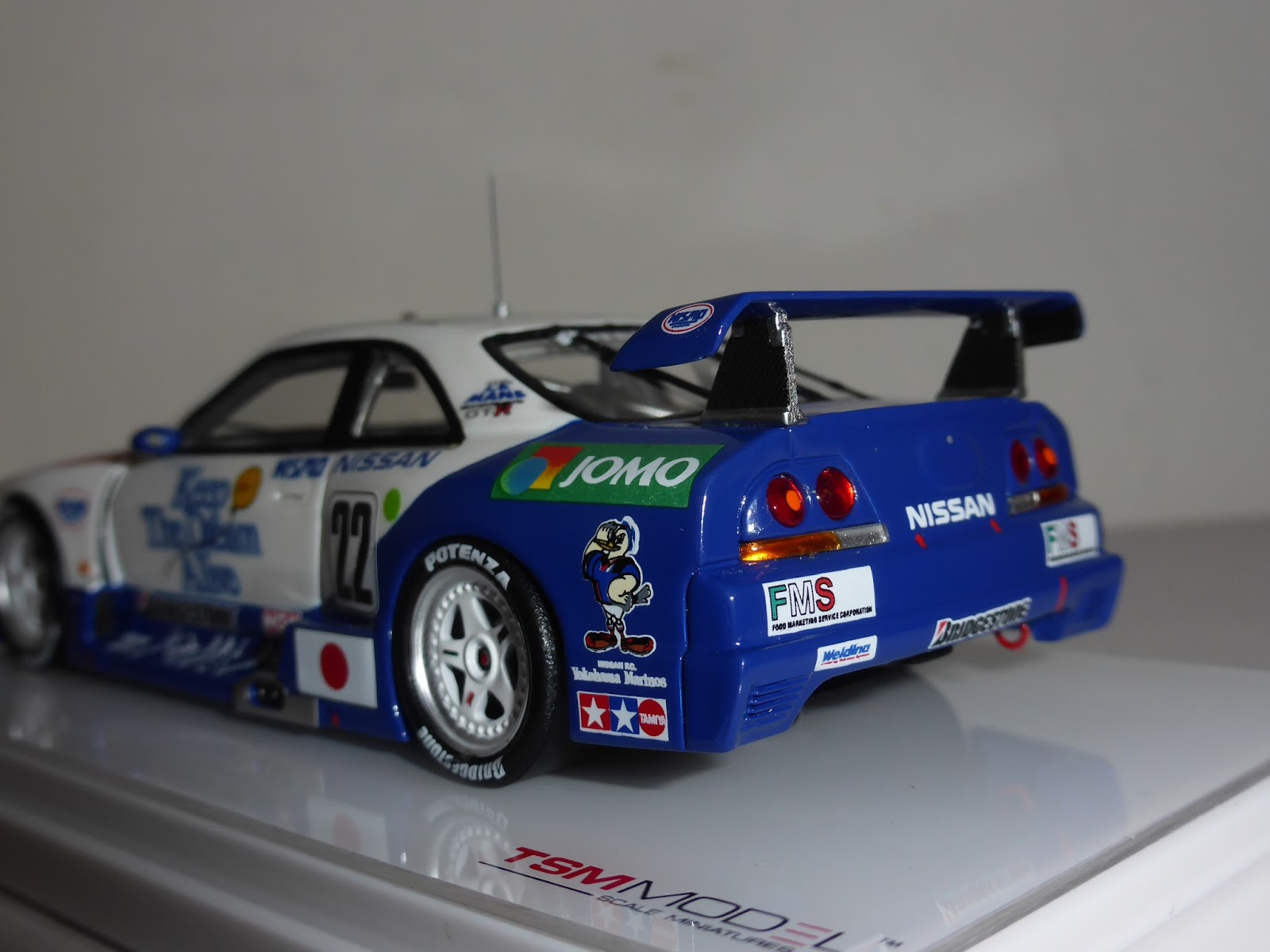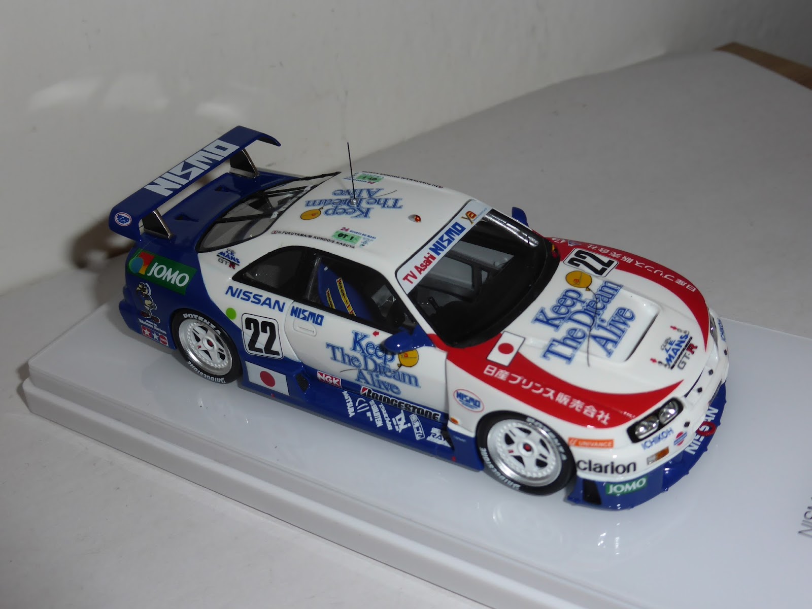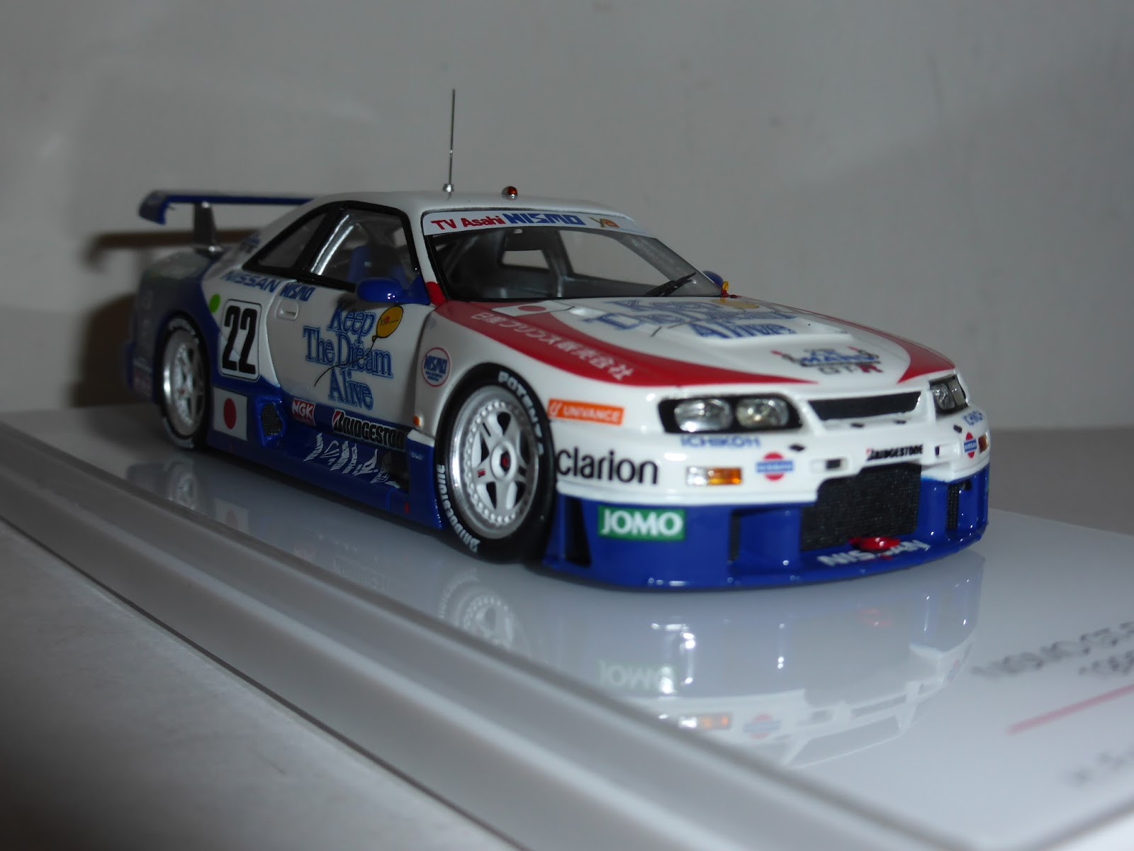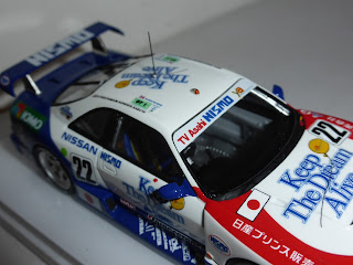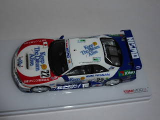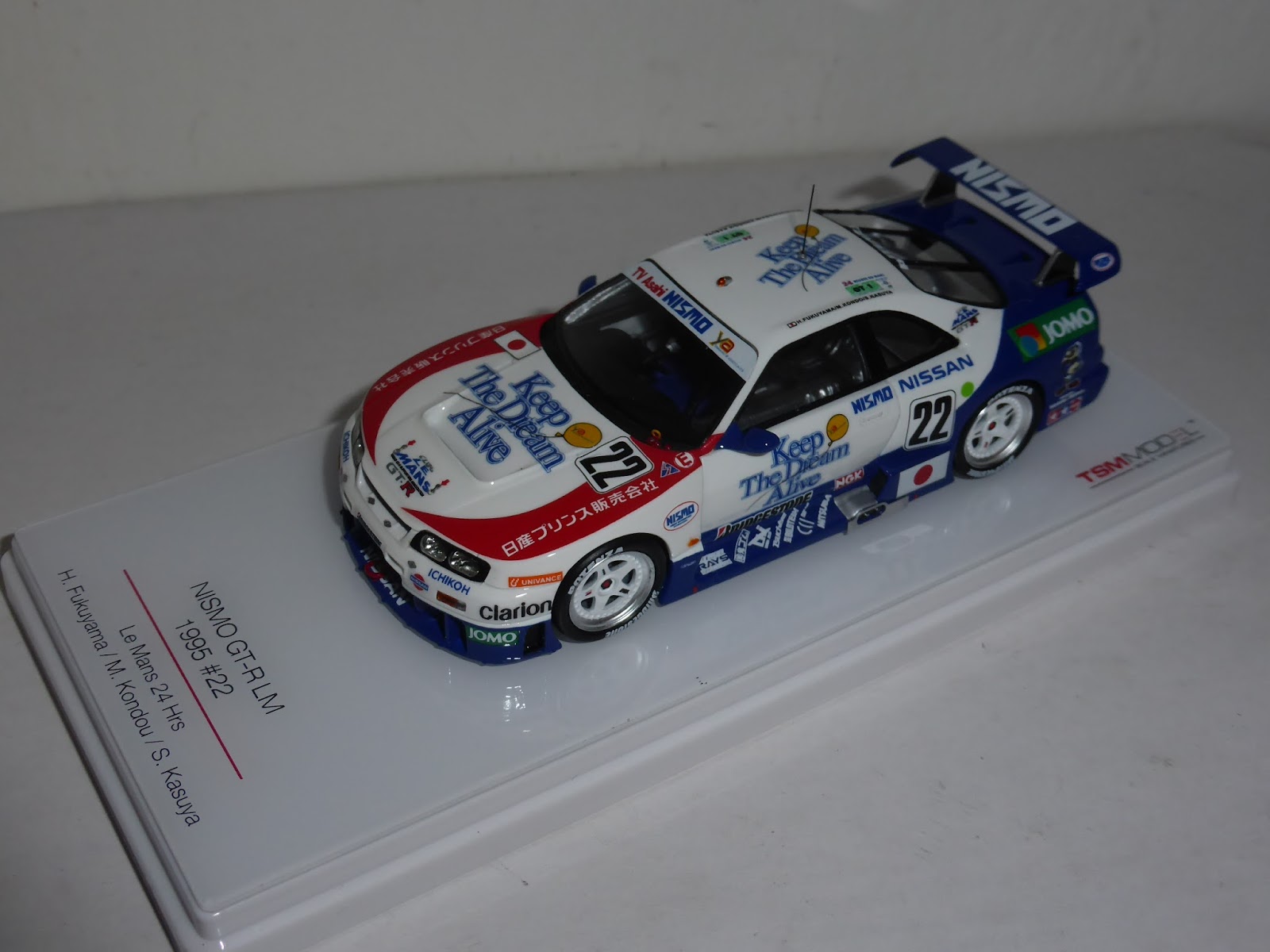 Dopo la sparizione dei kit in resina, era stata Ebbro a proporre la bellissima Nismo GT-R LM di Le Mans 1995. Ora arriva Truescale Model con una riproduzione molto accurata anche se non esente da piccoli difetti. Questa Nissan, di cui presto avremo anche la versione numero 23 (piloti Fukuyama/Kondou/Kasuya) e successivamente il modello in 1:18, è realizzata in resina con tutte le caratteristiche delle migliori miniature della categoria. Penso che i TSM Model di punta, tranne alcune infelici eccezioni, restino un gradino sopra alla media di Spark. Gli interni sono ben dettagliati, anche se le cinture di sicurezza sono solo parzialmente applicate: stranamente mancano infatti gli elementi alla base del sedile, visto che sono riprodotte soltanto le cinture che calano sullo schienale. Fra le caratteristiche migliori del modello, un\’ottima verniciatura bicolore, i gruppi ottici, le ruote e la finissima antenna. I vetri, in acetato, sono applicati con buona cura, ma vi sono da rilevare alcune imprecisioni nell\’incollatura delle fotoincisioni laterali che riproducono le cornici; se non altro si è evitata la brutta abitudine di Spark di riprodurre gli elementi laterali con un unico pezzo plotterato. Direi che ci troviamo di fronte a un modello che vale la pena avere in collezione, anche se con un minimo di attenzione in più TSM Model avrebbe potuto raggiungere i livelli di quelli che a mio avviso sono il punto di riferimento dei resincast, ossia gli HPI Mirage.